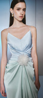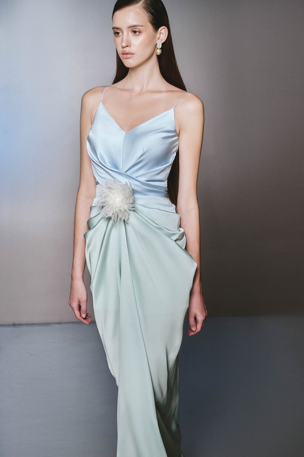 ميزات خاصة: Crossover at the waist, Draped skirt, Spaghetti straps, Dart lines in the fronts