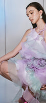 Ruffle trim layers all over the dress, Big flower on the side, Halter neck with tie, Transition ombre light green and violet