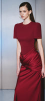 This dress features a stunning sheath silhouette, accentuating your natural curves. The draped design adds a touch of elegance and sophistication to your look. Crafted from a blend of cotton and silk, this dress offers a comfortable and luxurious feel while flattering your figure. Perfect for formal occasions or a night out, this dress is a must-have in your wardrobe.