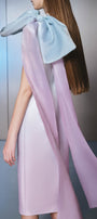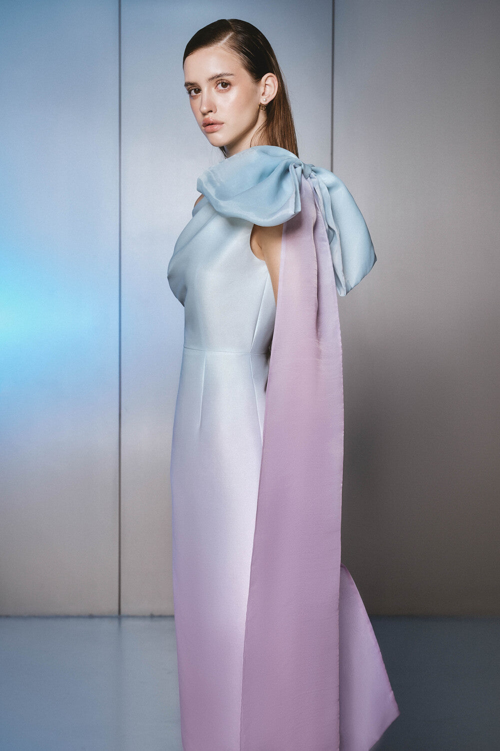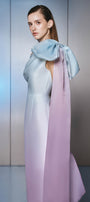 Discover modern elegance with our dress. It features a bold bow on the shoulder, an asymmetric design, and stunning ombre blue and purple hues. Elevate your evening look with this unique and stylish piece.