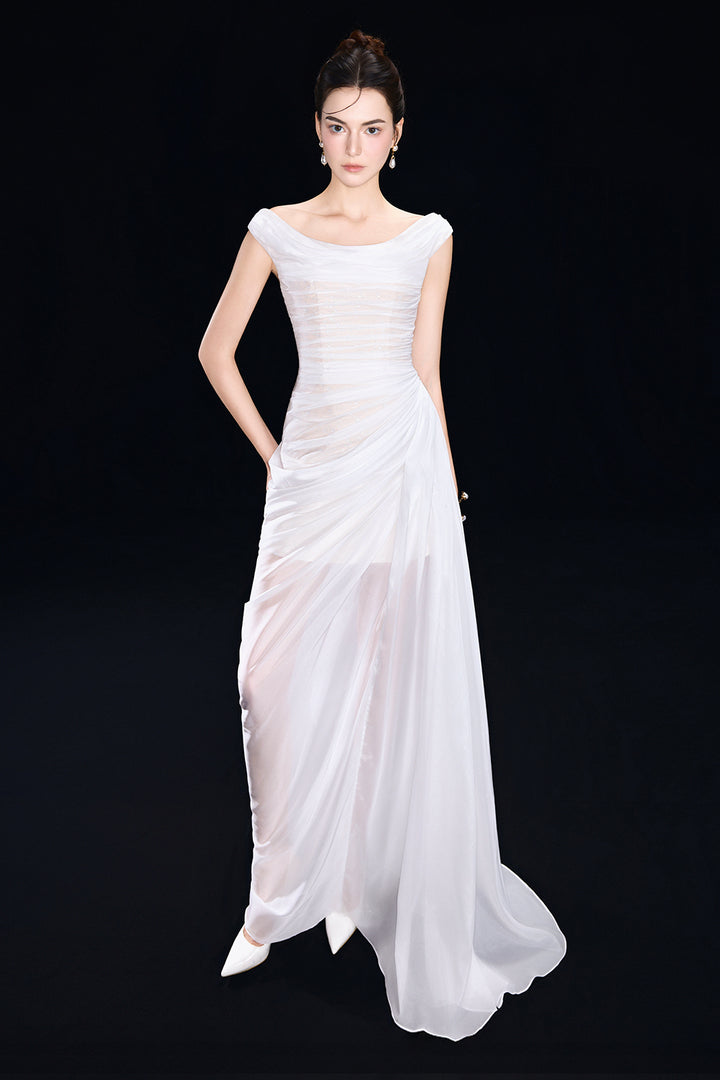 This elegant floor-length chiffon dress features a sophisticated boat neck and a graceful side drape that enhances its silhouette. The lace-up back adds a refined touch, allowing for a customizable fit that combines comfort with style. Perfect for formal occasions, this sheath dress offers a timeless look with expert craftsmanship.