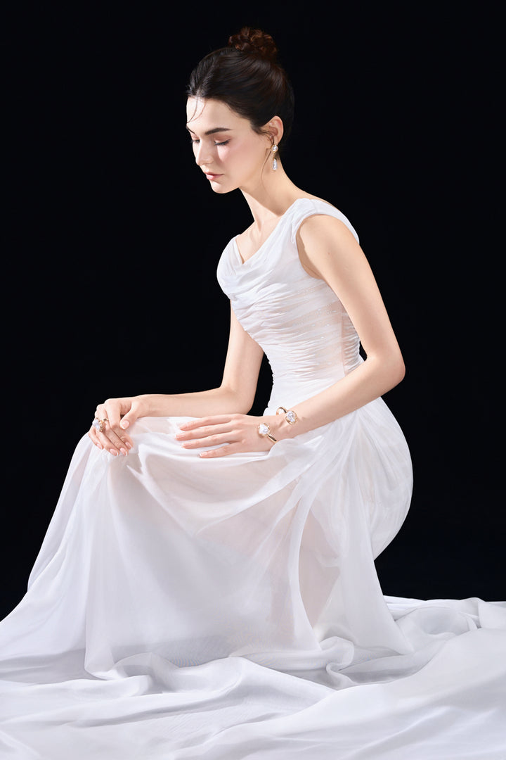 | 特殊功能 | Gathered uppder bodice, Draped on the side with asymmetric flap, Sheer skirt, Lace up at the back |
