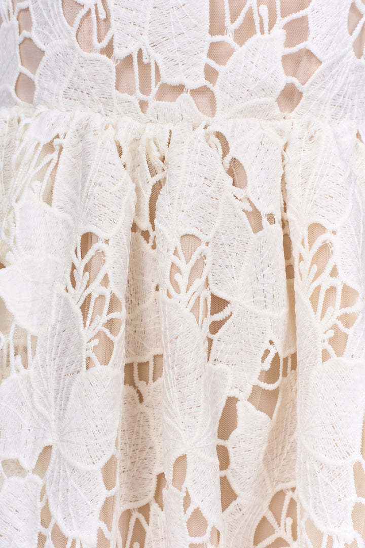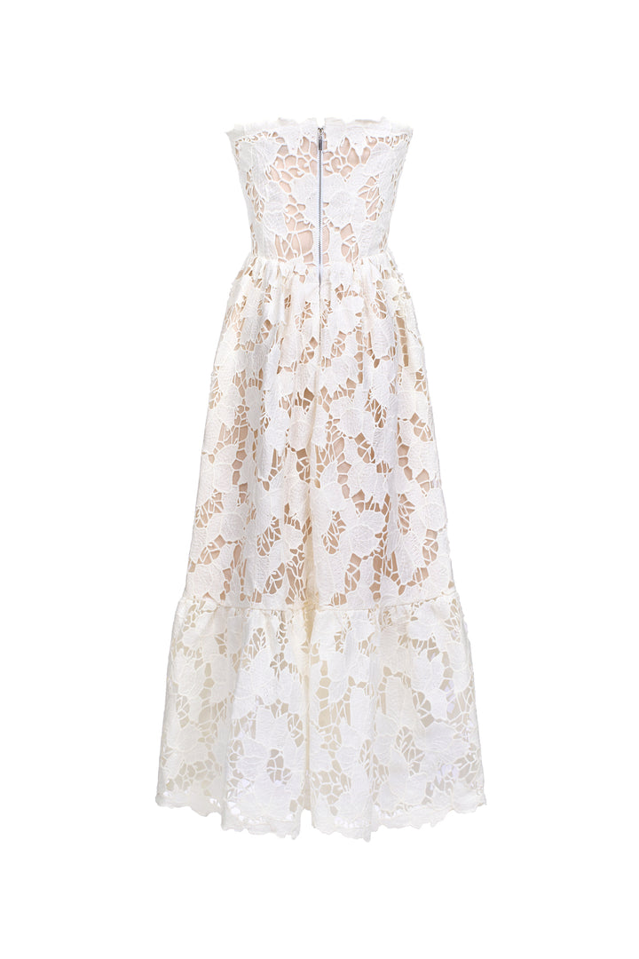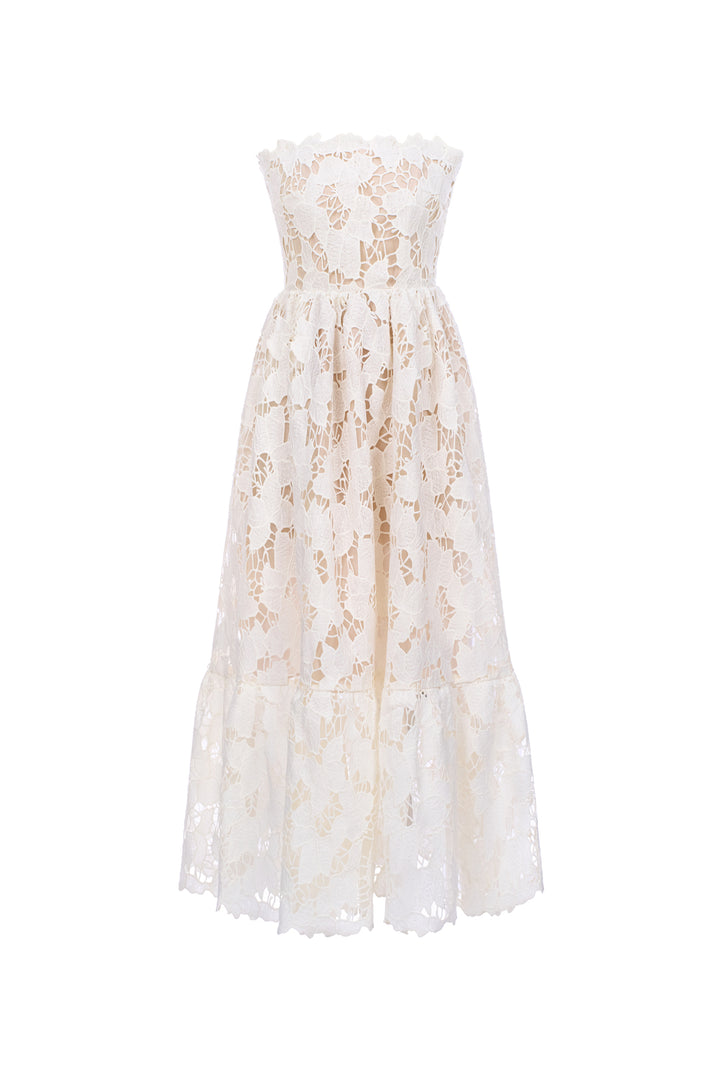 This dress features a straight-across neckline that offers a clean, elegant silhouette. The drop waist design enhances the natural flow of the skirt, which falls gracefully to ankle length. Crafted with delicate lace, this dress combines classic sophistication with modern structure, making it ideal for formal occasions or refined daytime events.