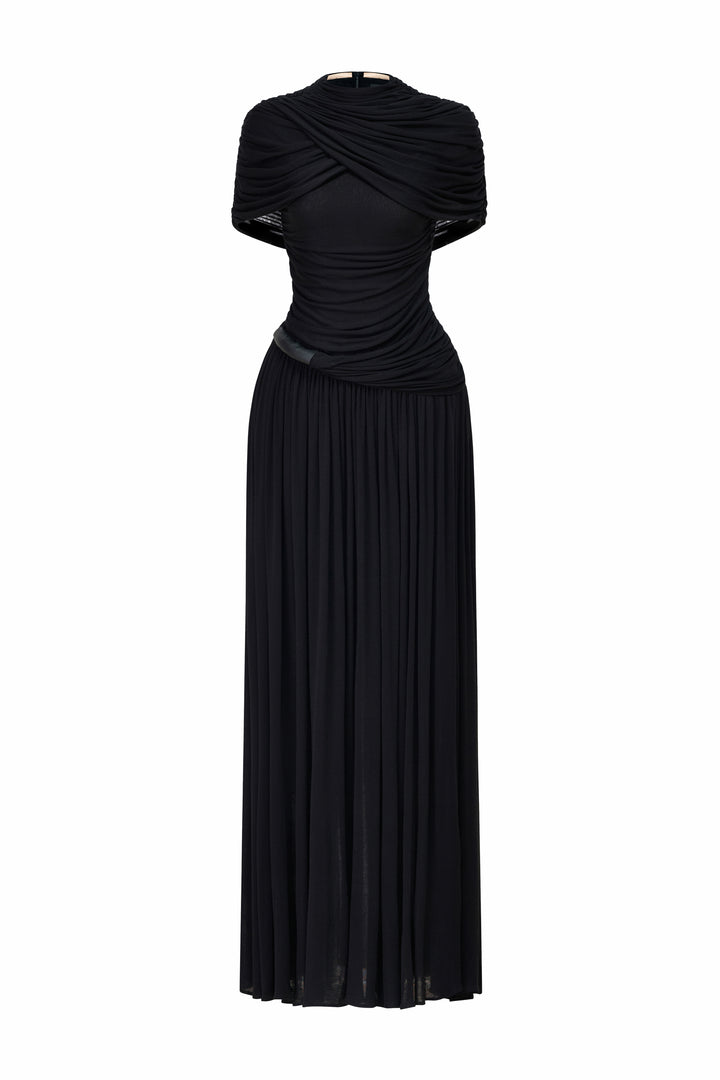 | 特殊功能 | Draped bodice and cape, Pleated skirt, Ruched waist with faux leather belt detail |