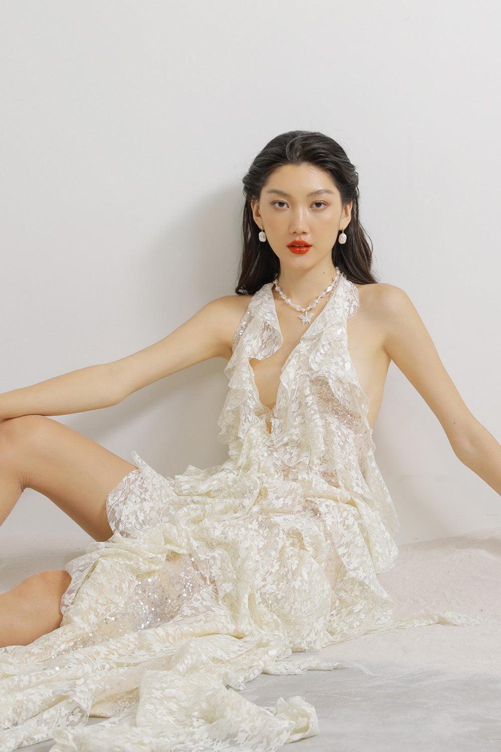 Berry Asymmetric Halter Neck Lace Maxi Dress