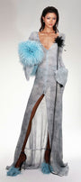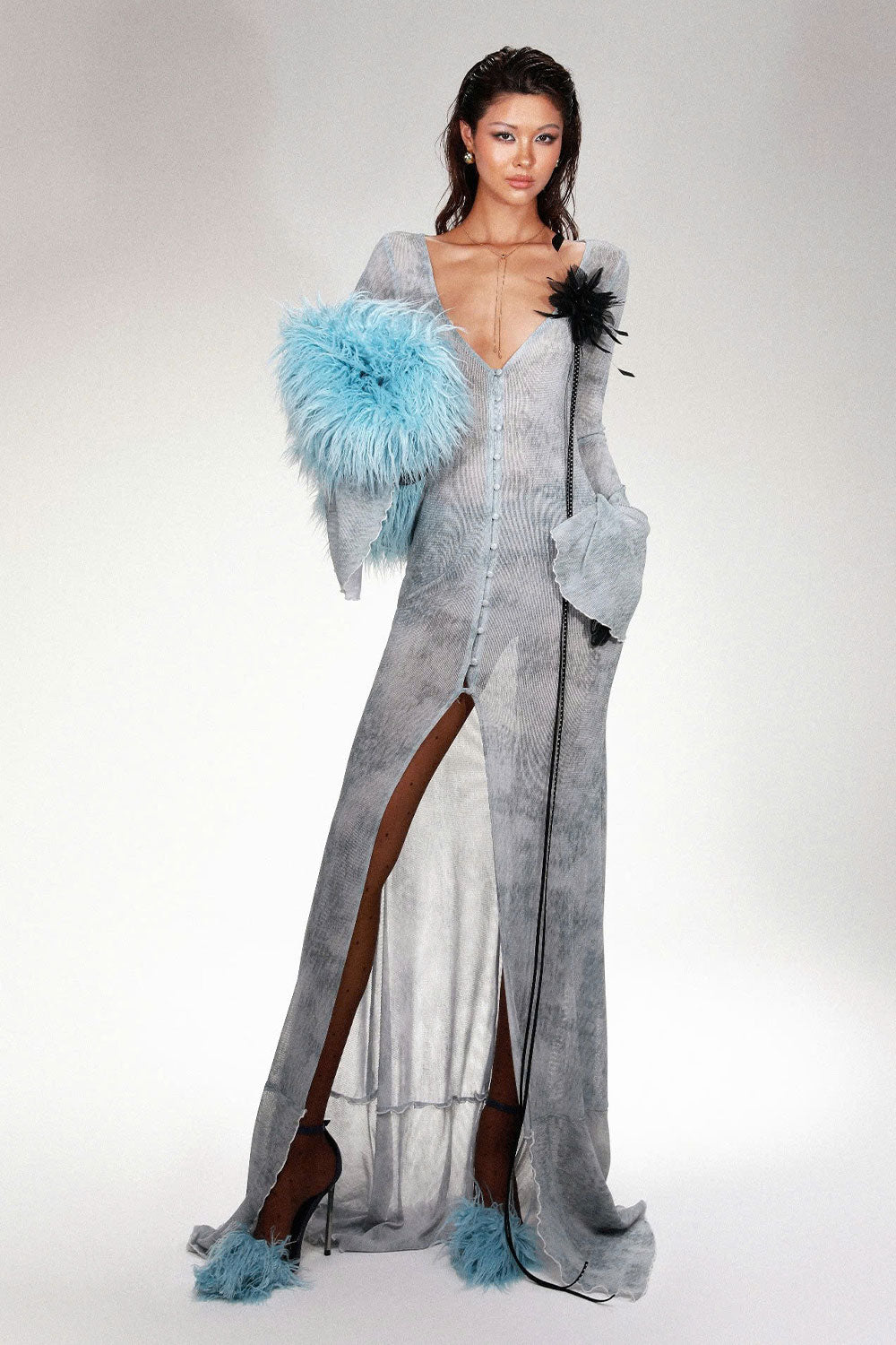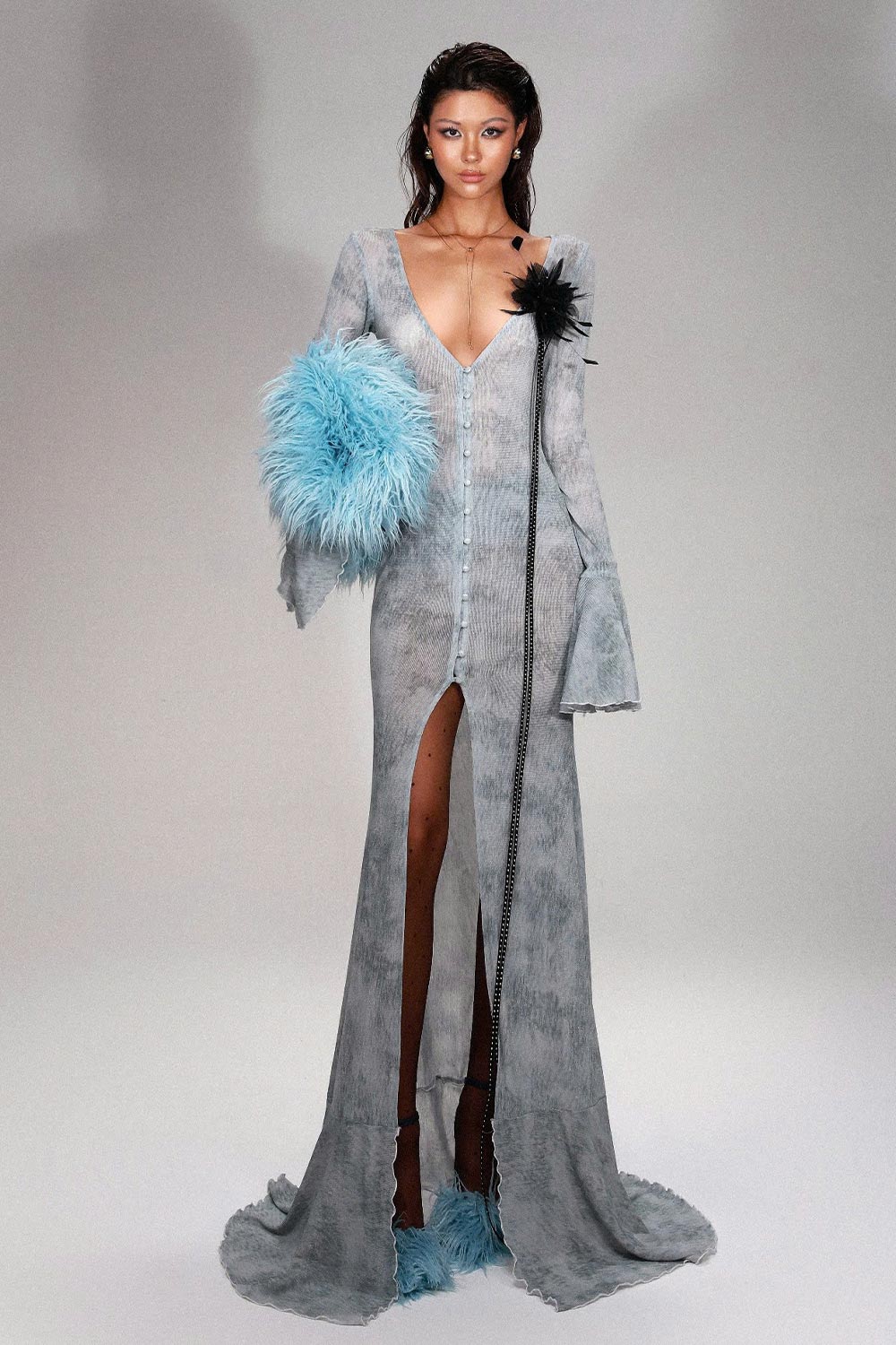 High front slit, Button and knot closure, Ruffle trimming, See-through design, Smoky effect, Elastic