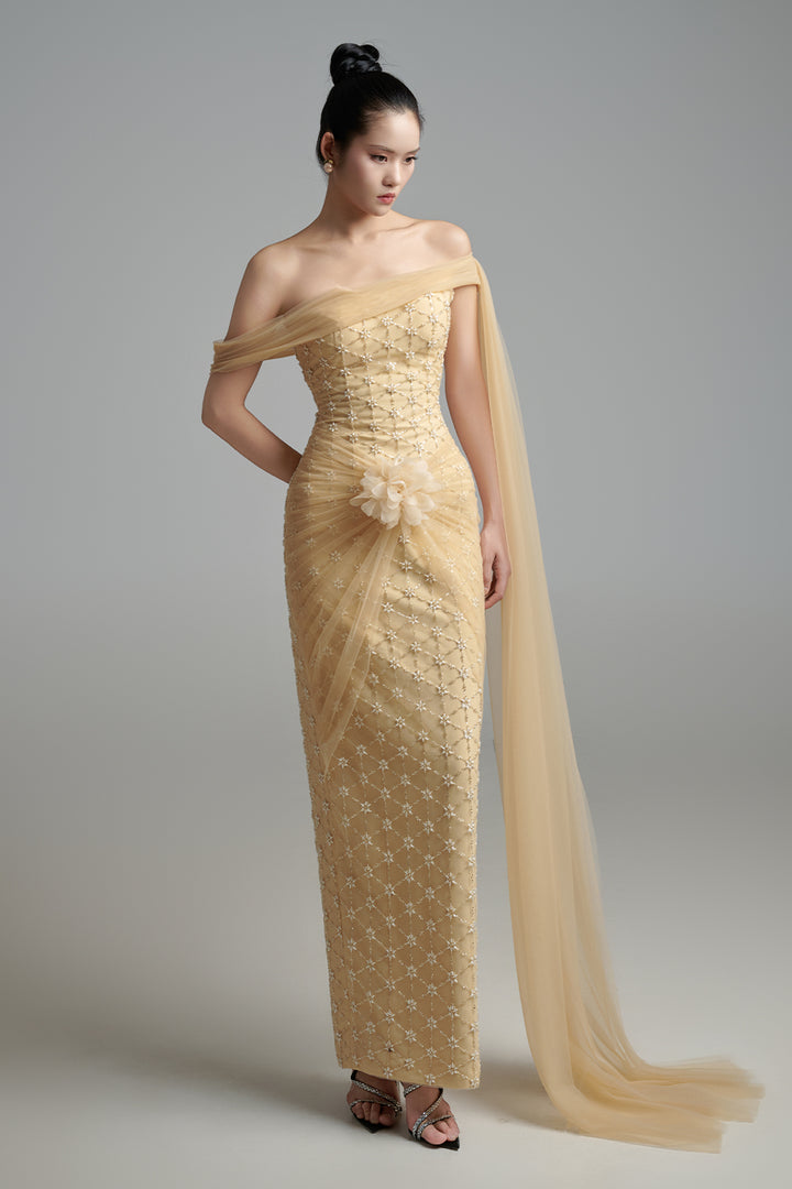 | 特殊功能 | Asymmetric off-shoulder with flap, Twisted waist with floral applique, Geometric pattern with beads, High slit back |