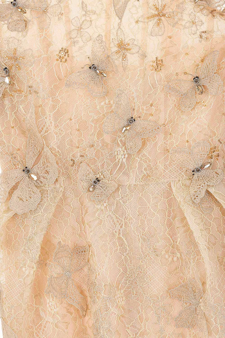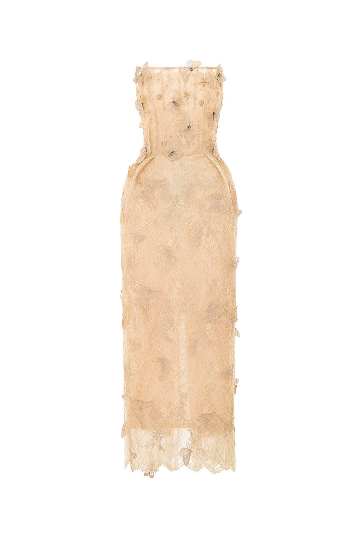 Expertly crafted with delicate embroidered lace, this dress exudes elegance and sophistication. The strapless design allows for a versatile fit, while the butterfly-inspired pattern adds a whimsical touch. Perfect for any special occasion, this dress is sure to make you feel graceful and beautiful.