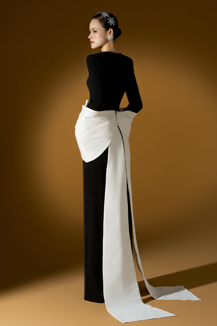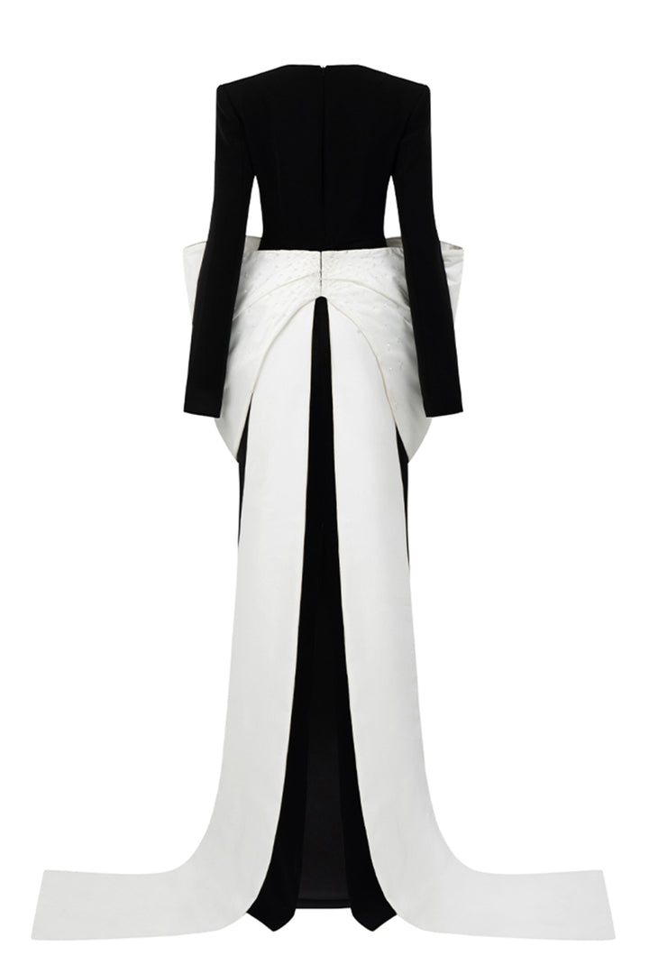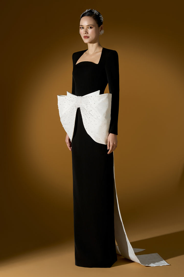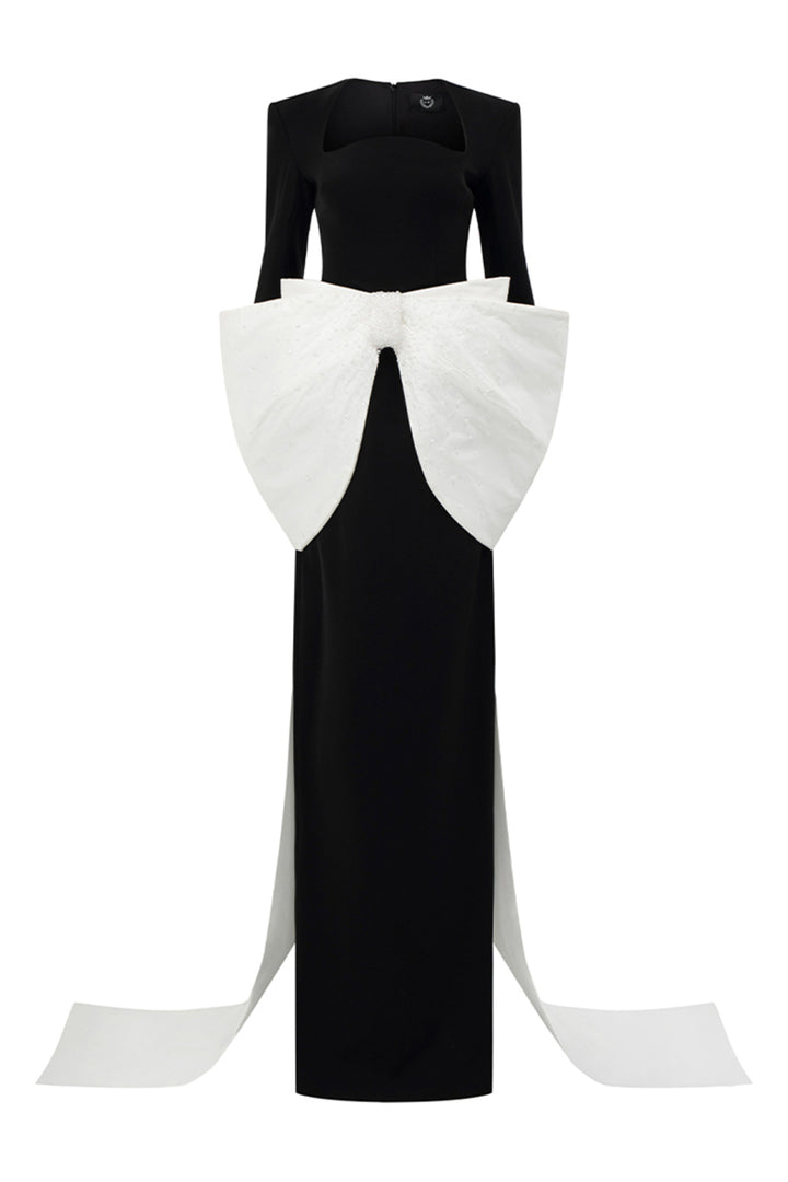 This elegant dress features a flattering sheath silhouette and a sophisticated bow tie detail. Perfect for any formal occasion, it offers a polished and timeless look. Upgrade your wardrobe with this must-have piece.