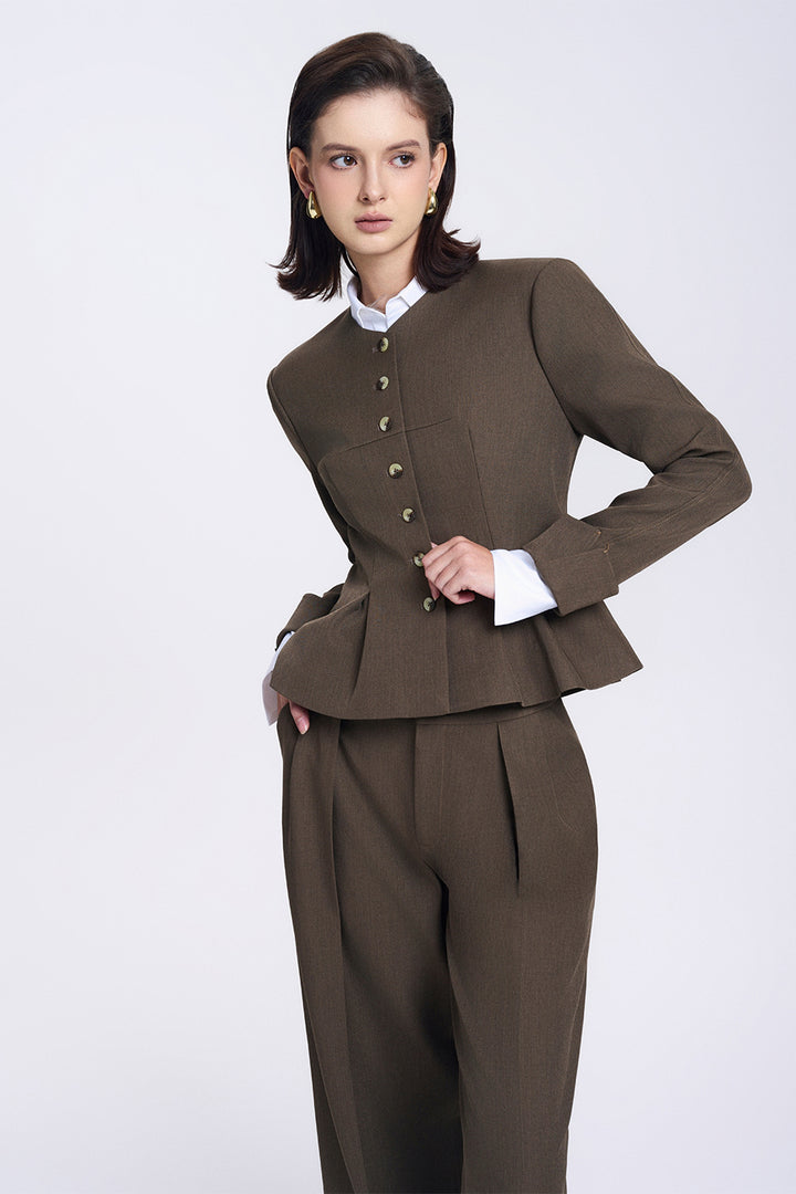 This jacket features a tailored peplum with a delicately pleated hem that enhances its structured silhouette. The inverted cuff sleeves add a refined, modern twist to classic tailoring, ensuring elevated style and a polished finish. Crafted from durable twill, this jacket combines sophistication with dependable wear, ideal for professional settings or stylish layering.