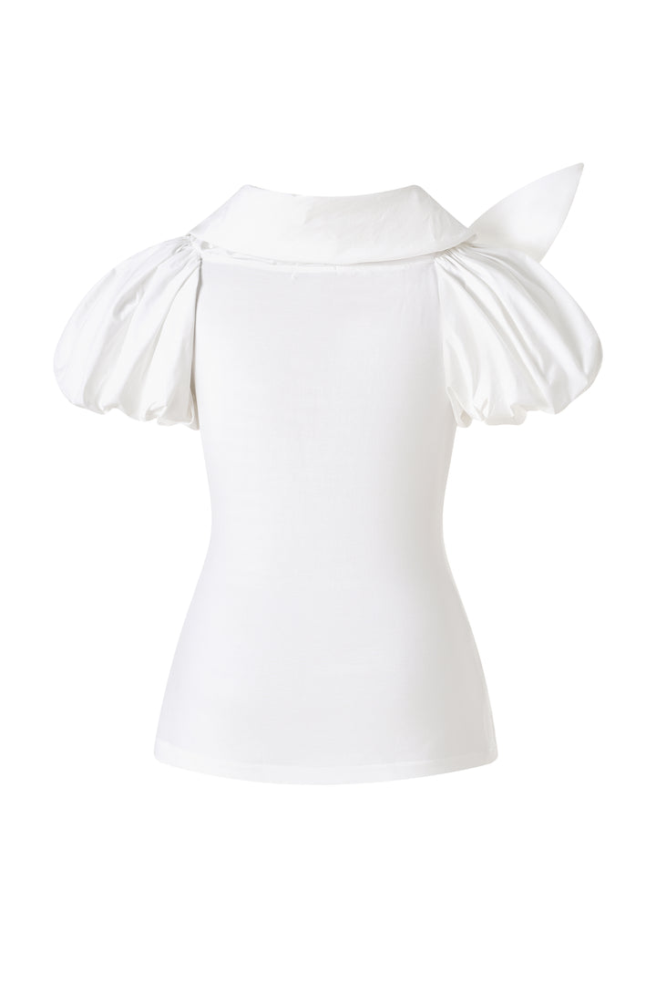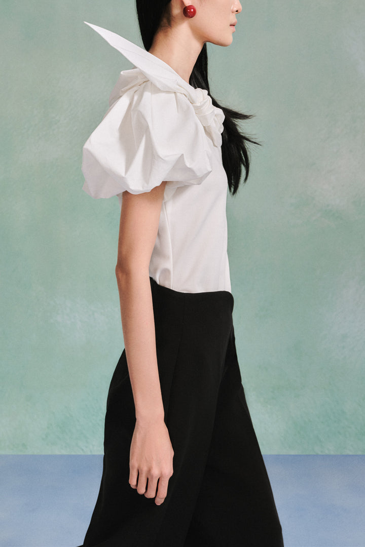 The top is expertly crafted from high-quality cotton, offering a comfortable and breathable wear. Its distinctive puffy sleeves create a stylish silhouette while providing freedom of movement. The blouson design ensures a balanced fit that flatters various body types, making it a versatile addition to any refined wardrobe.
