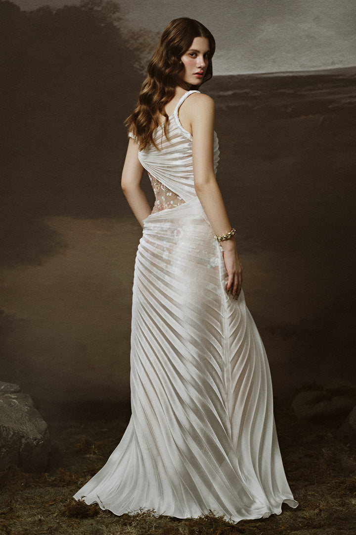 | 特殊功能 | Asymmetric pleated draping, Hand-embroidered floral beneath layer, Slit skirt with metal pin, Asymmetric twisted shoulder, Two-layers |