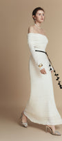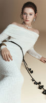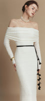 This elegant and feminine dress features an off-shoulder design and delicate lace details. The sheath silhouette and ankle length create a flattering and sophisticated look. Perfect for special occasions or a night out, this dress will make you feel confident and chic.