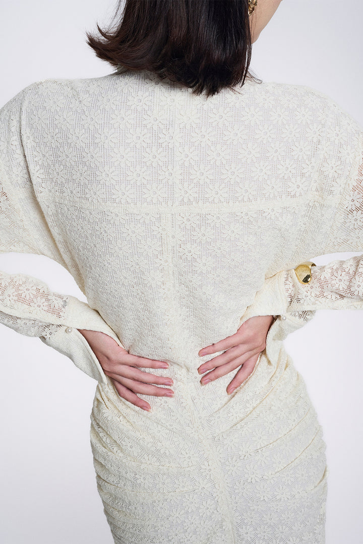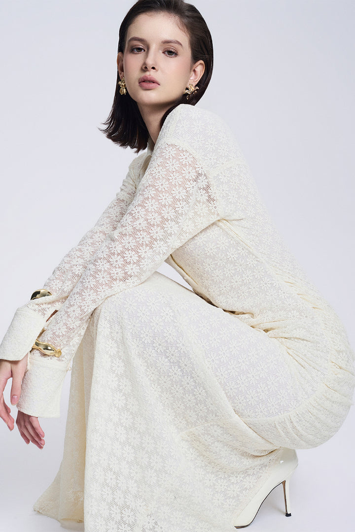 This maxi dress features a tasteful gathered detail at the waist that enhances the silhouette, paired with wide sleeve cuffs that add a refined touch. The delicate lace fabric offers both elegance and subtle texture, making it an ideal choice for sophisticated occasions. Designed to combine comfort and style, this dress delivers a polished, expert look with effortless grace.