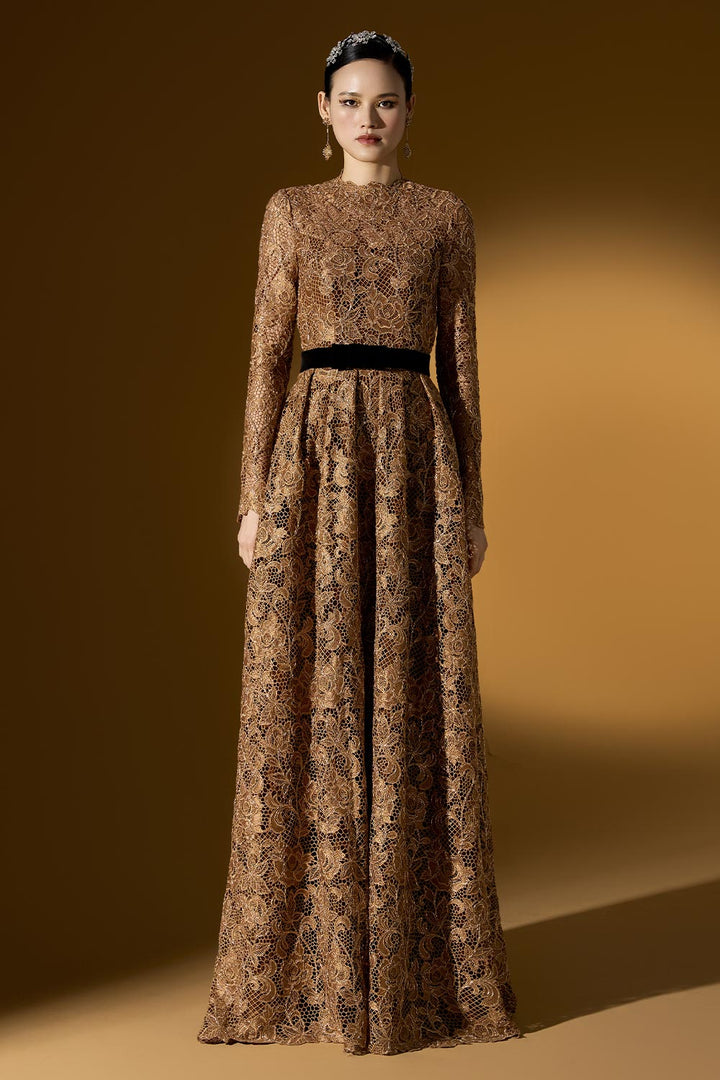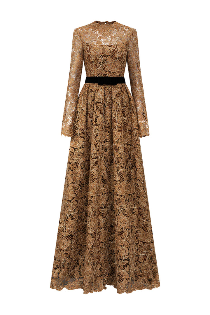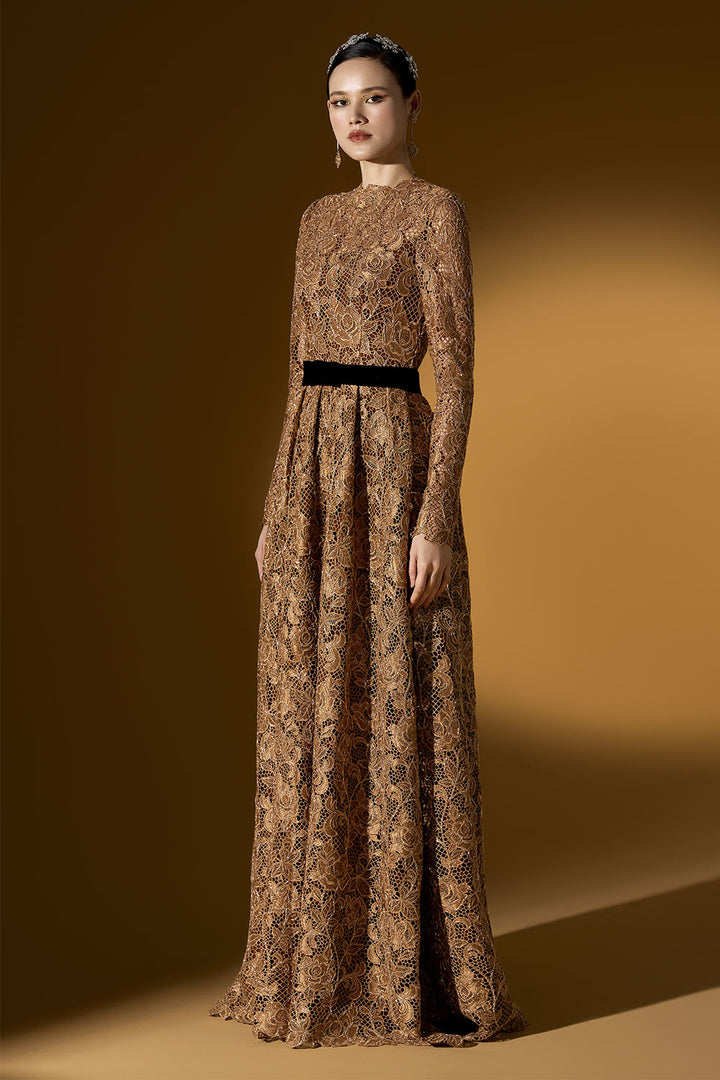 This dress features a flattering and elegant A-line silhouette, enhanced by classic box pleats. The result is a timeless and sophisticated look that will make you stand out on any occasion. Expertly crafted with lace for a touch of femininity and grace.