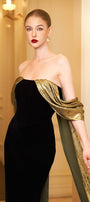Expertly crafted from luxurious silk crepe material, the dress is a stunning addition to any wardrobe. The form-fitting sheath silhouette flatters the figure while the off-shoulder neckline adds a touch of elegance. Perfect for any formal event or special occasion, this dress is a must-have for the fashion-forward individual.