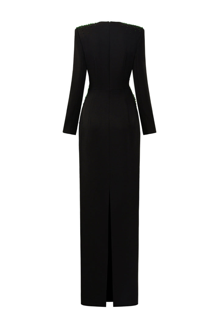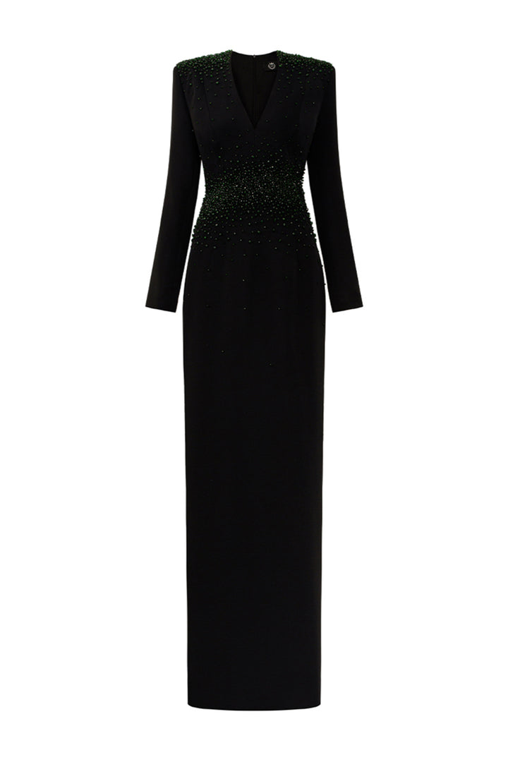 This dress features a flattering V-neck and a sleek sheath silhouette. Crafted from high-quality crepe fabric, it provides a sophisticated and elegant look. Perfect for formal occasions, this floor-length dress is a timeless addition to your wardrobe.
