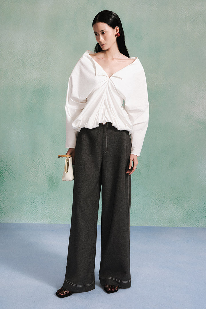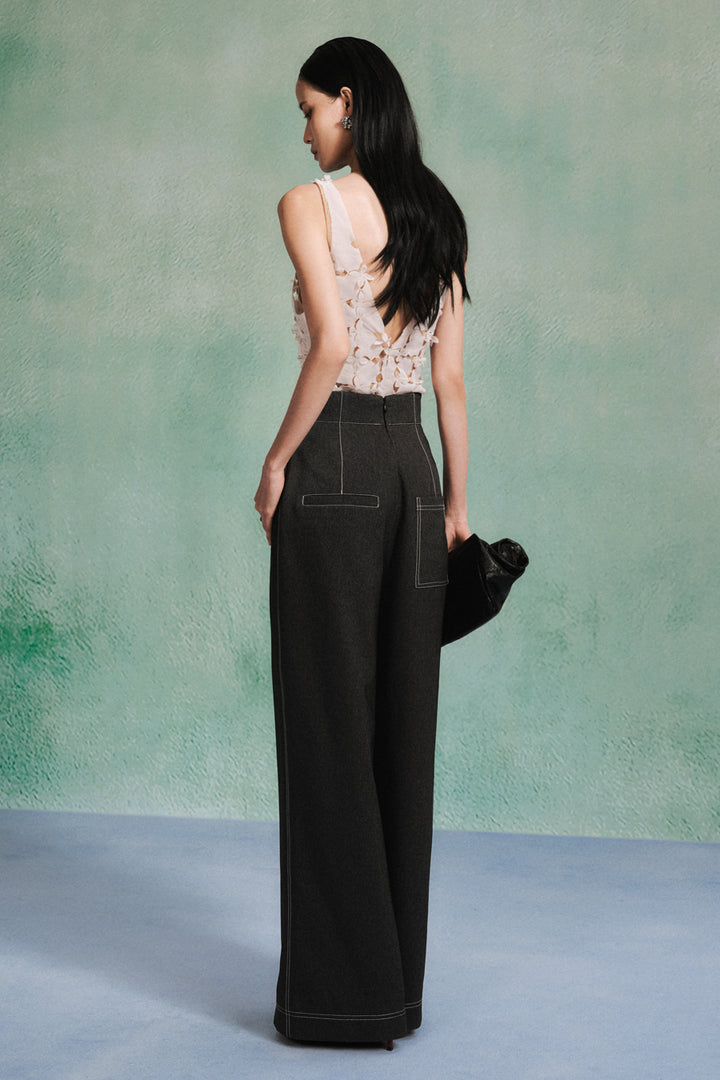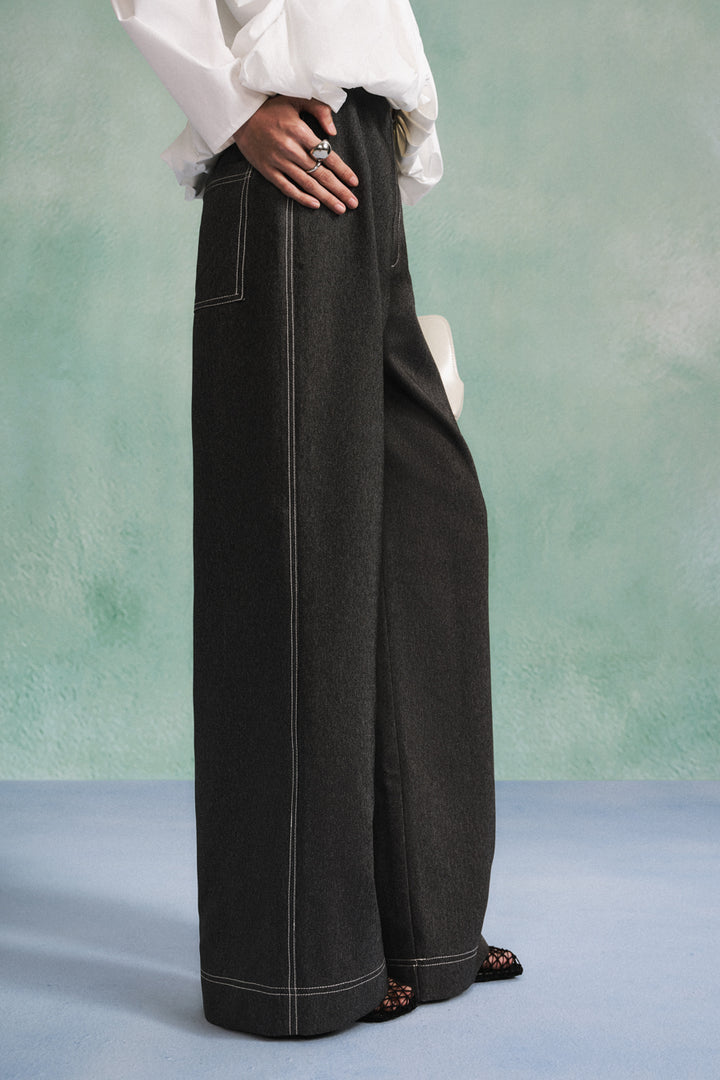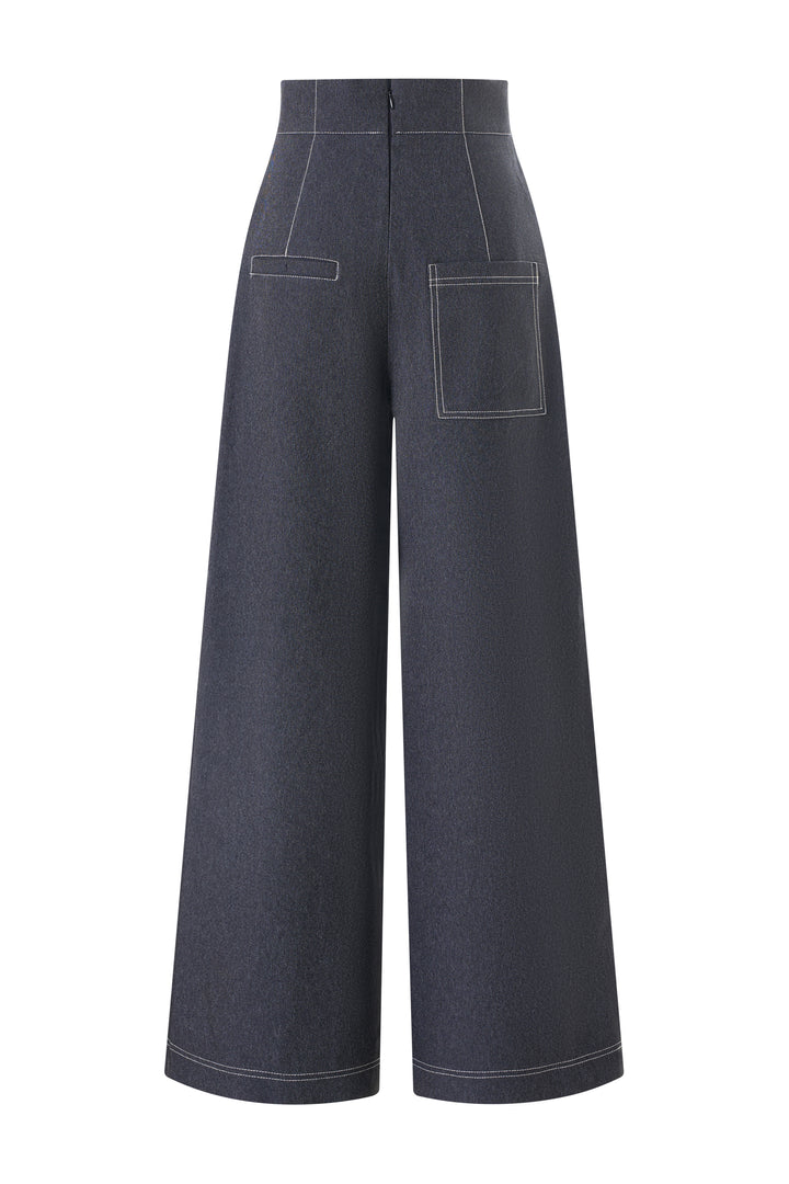 | 特殊功能 | Patch pocket at the back, Center-front notch detail, Wide-leg silhouette, Stitching lines |