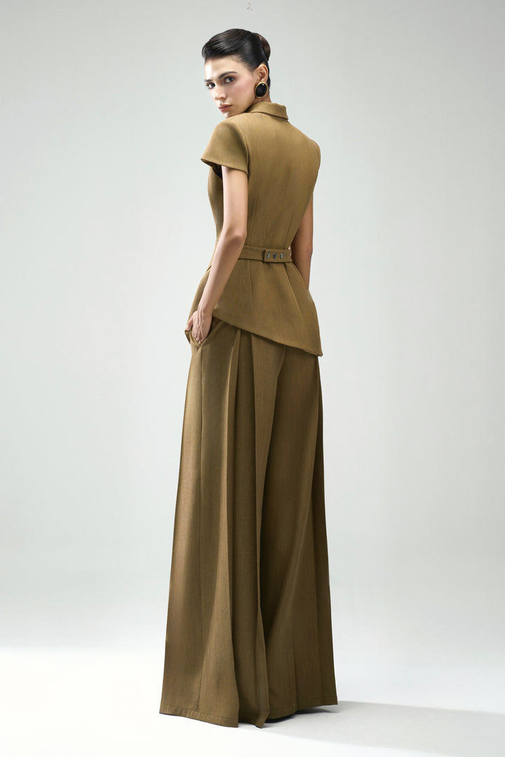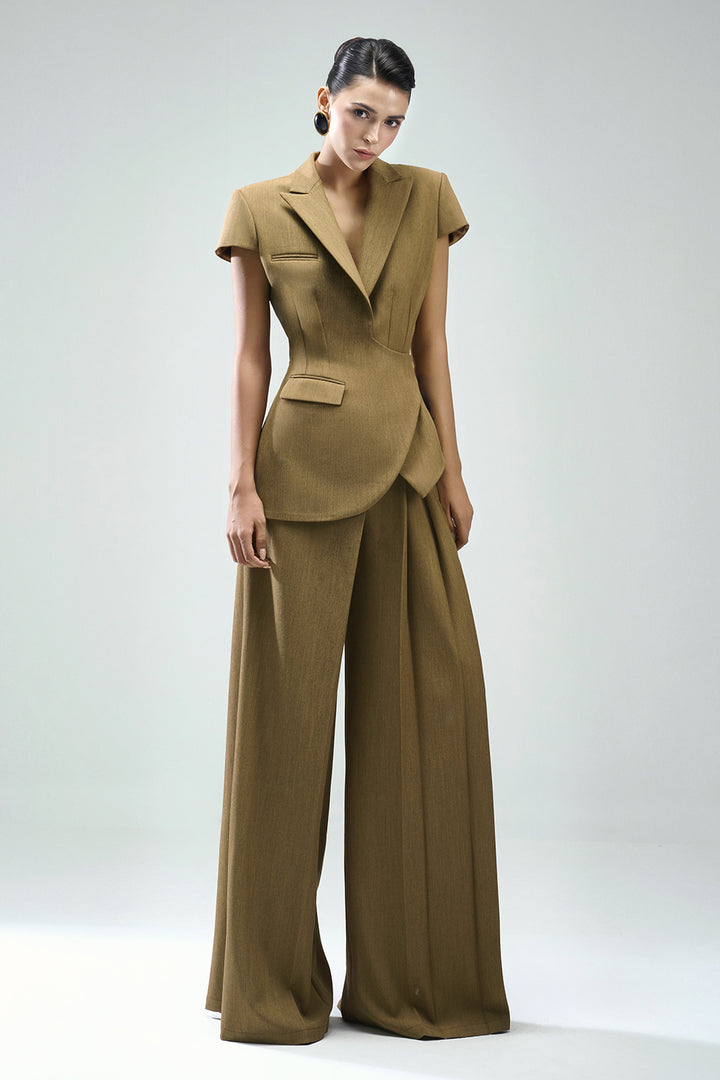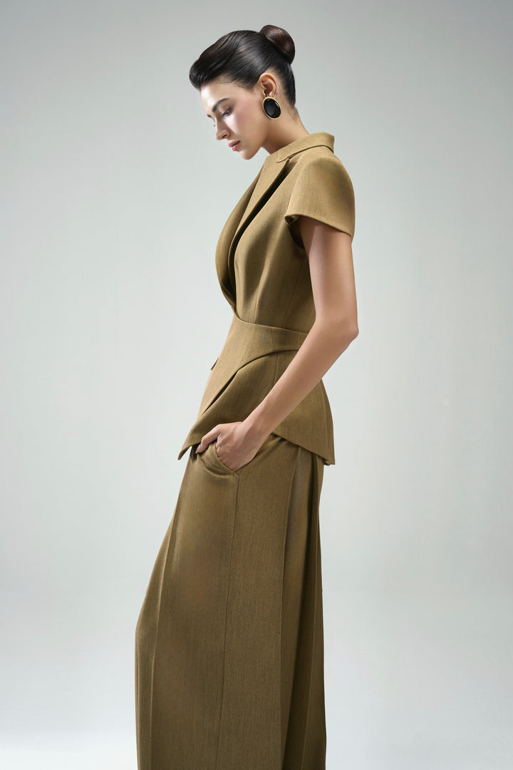 The pants blend elegant draping with a sleek straight cut for a refined silhouette. Crafted from crinkle crepe fabric, these pants offer subtle texture and fluid movement, enhancing comfort and style. Their floor-length design lends a sophisticated touch, perfect for both formal occasions and polished everyday wear, combining expert tailoring with versatile ease.