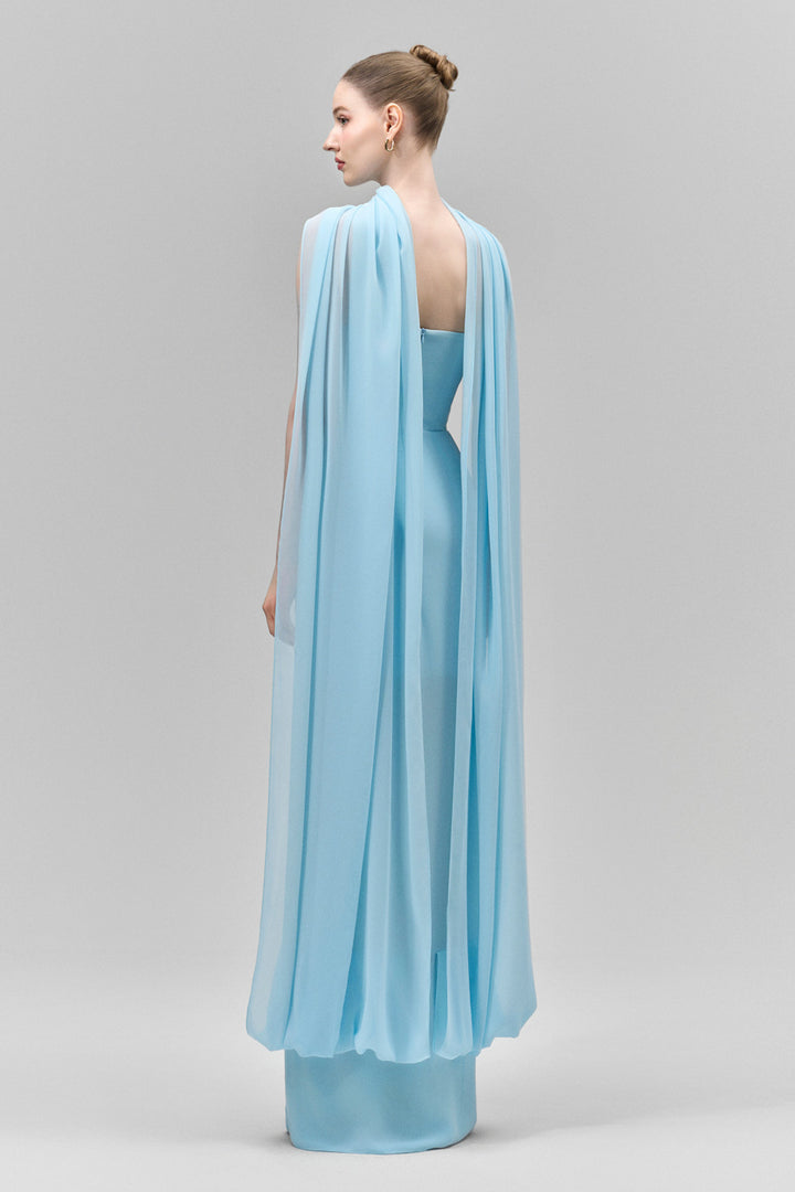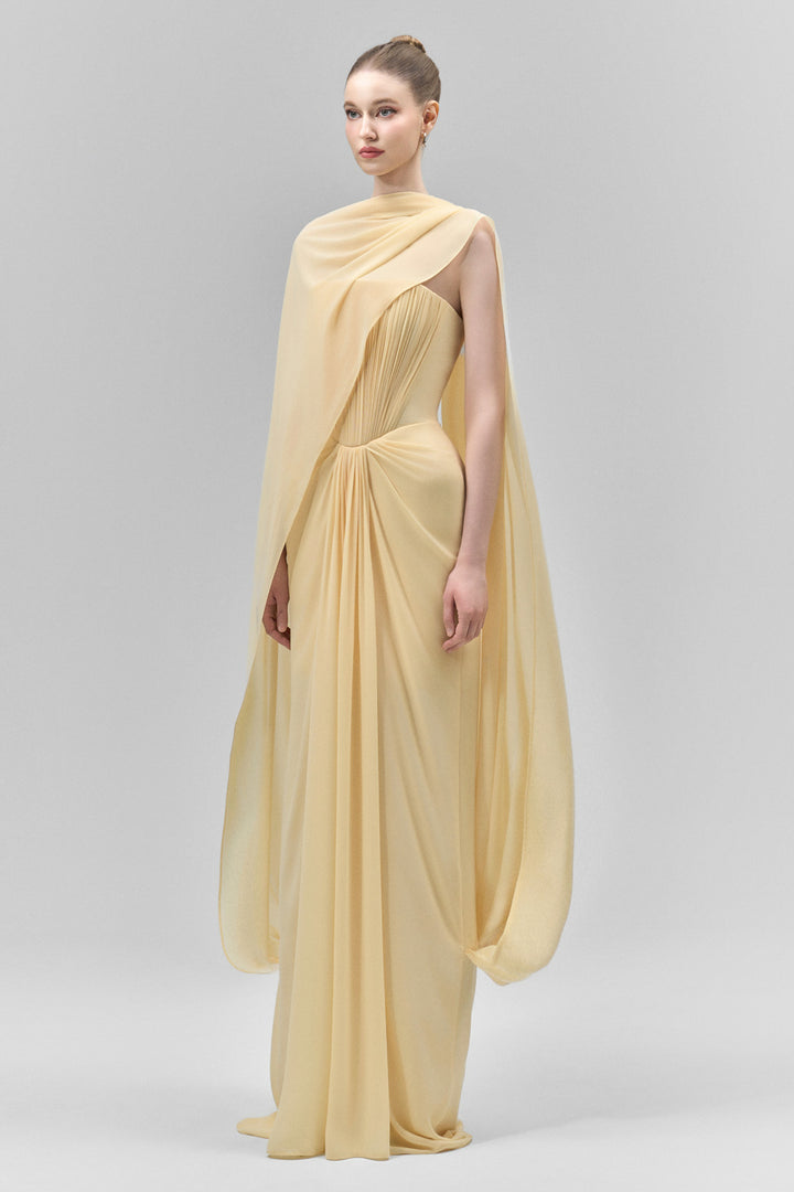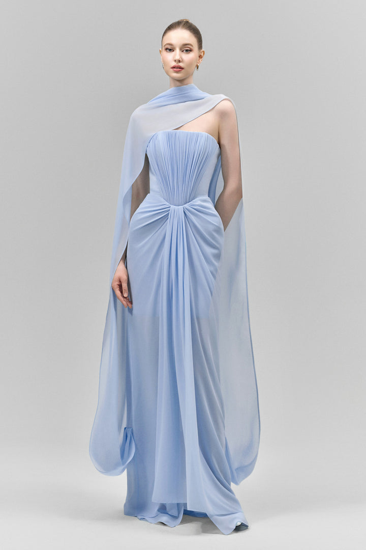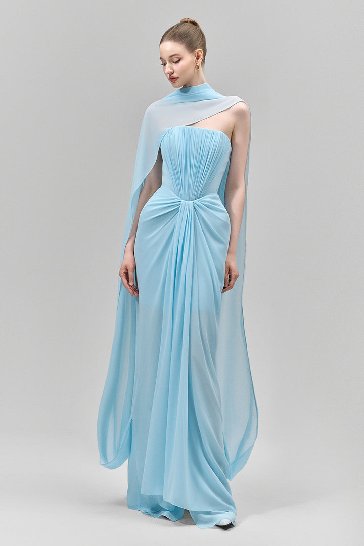 The dress boasts a chic scarf neck that gracefully drapes at the center, creating a refined focal point. Its pleated chest detail adds subtle texture, enhancing the dress’s sophisticated silhouette. Crafted from flowing chiffon, this floor-length gown offers timeless elegance with expert tailoring.