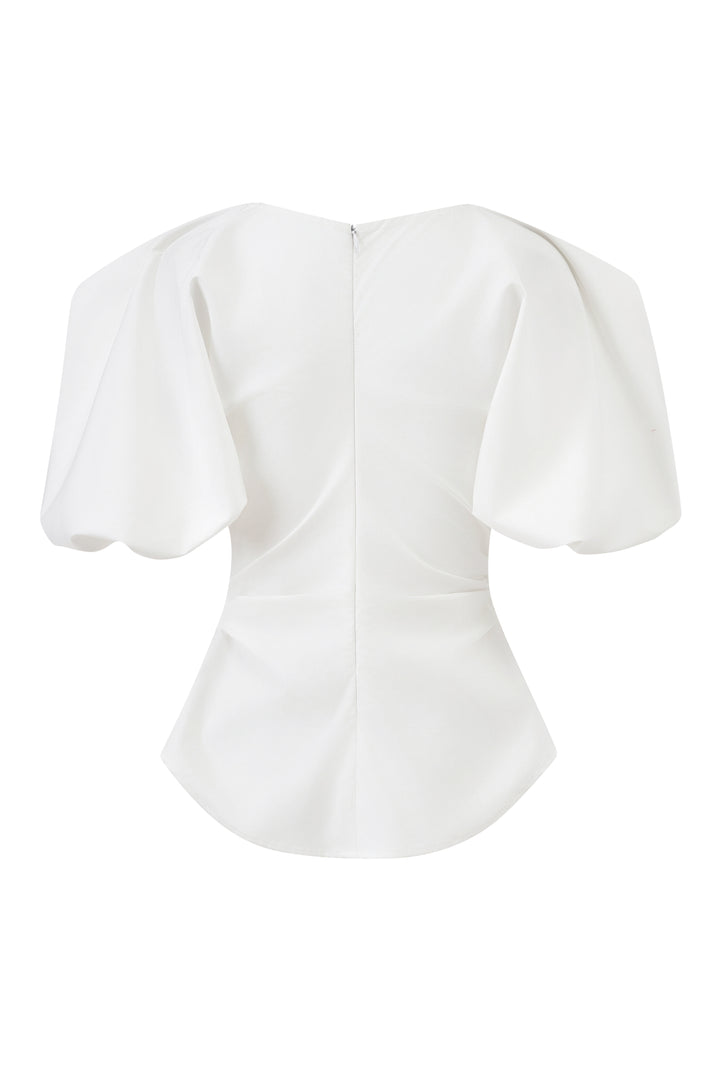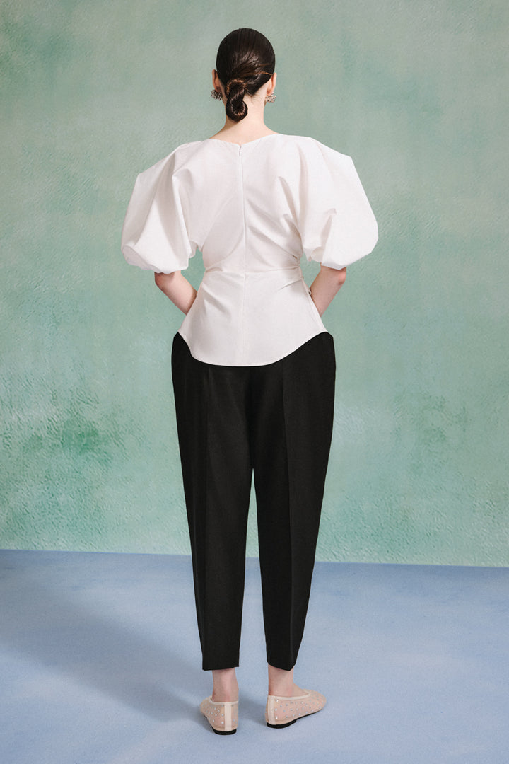The top combines structured elegance with comfortable wearability. Crafted from soft cotton, it features a flattering peplum silhouette that accentuates the waist, while its puffy sleeves add a contemporary, fashion-forward edge. Ideal for both professional and casual settings, this top offers a refined look without sacrificing comfort or breathability.