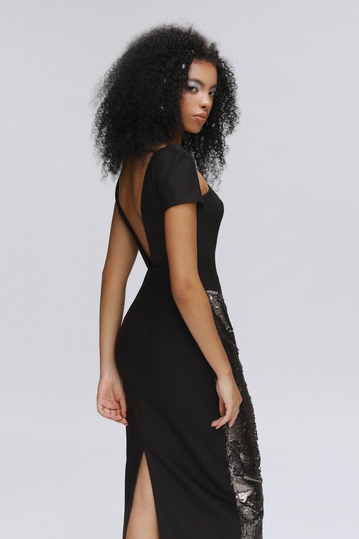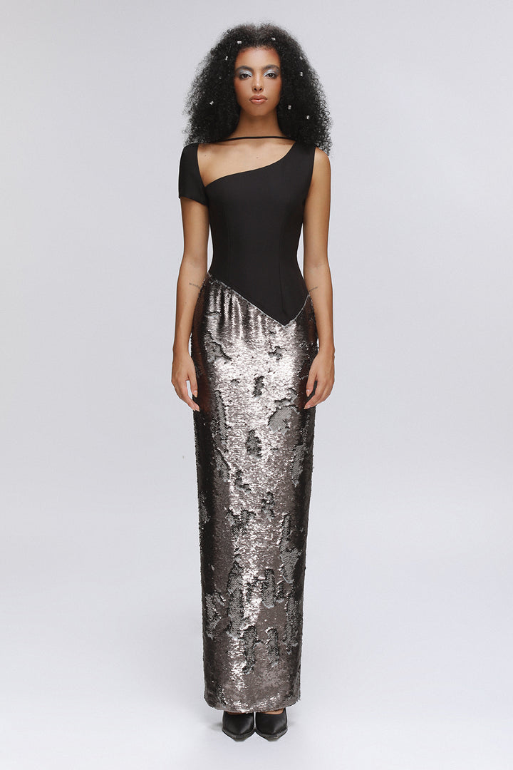 | 特殊功能 | Asymmetric neck and sleeves, String connect on the neck, Sequin stain-like on the front skirt, Diagonal waist line, Back slit, Open back |