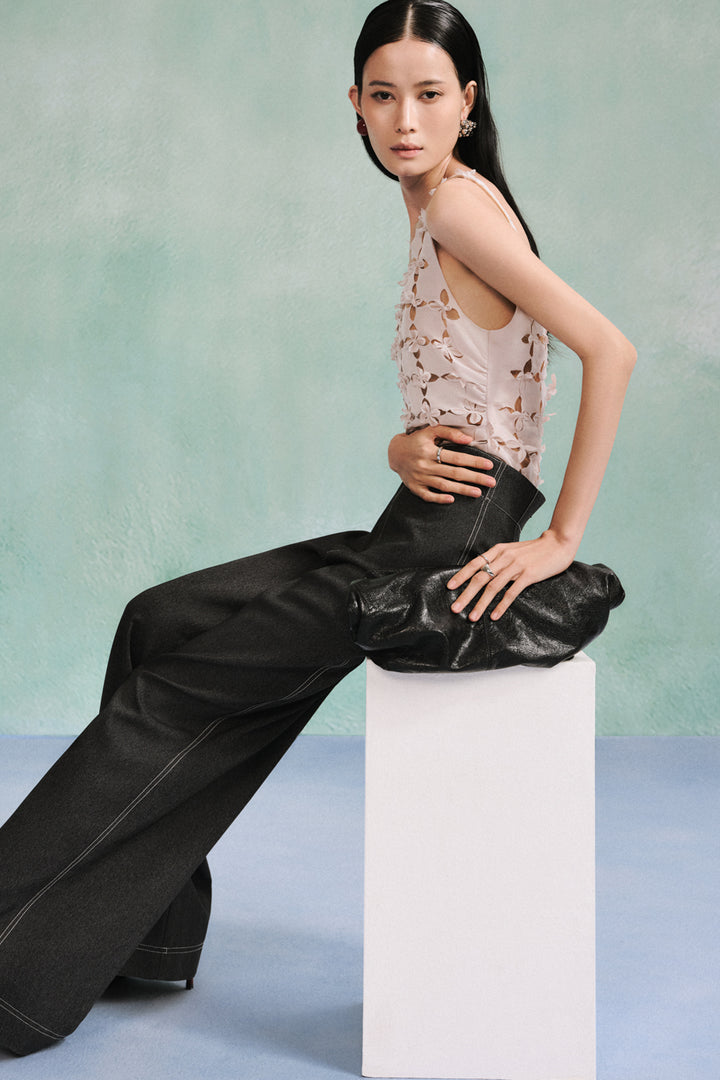 Elevate your style with the top, where delicate silk chiffon meets bold floral appliques for a striking silhouette. This daring piece hugs your curves with confidence while adding a touch of elegance and edge, perfect for making an unforgettable statement at any evening event. Embrace your bold side with a top designed to turn heads.