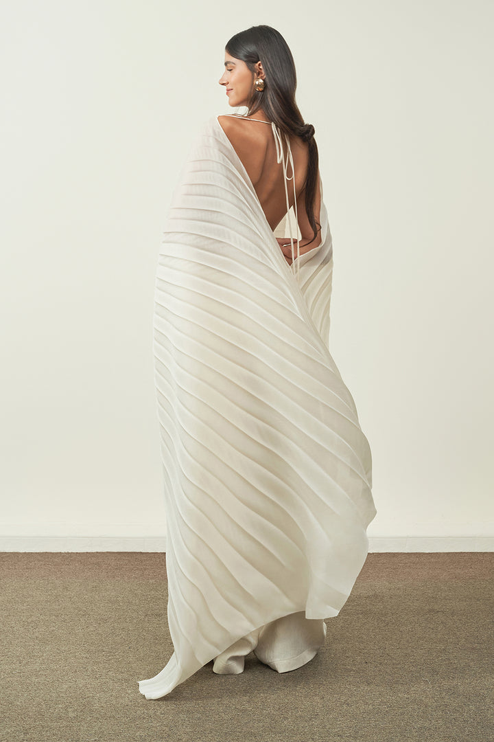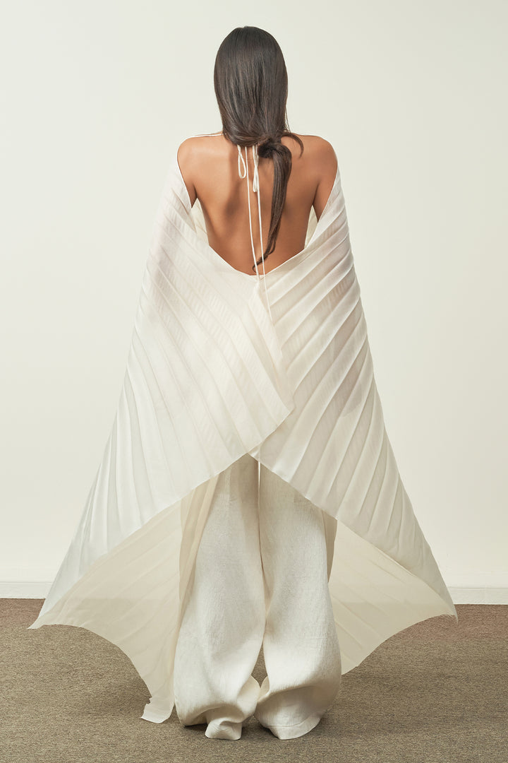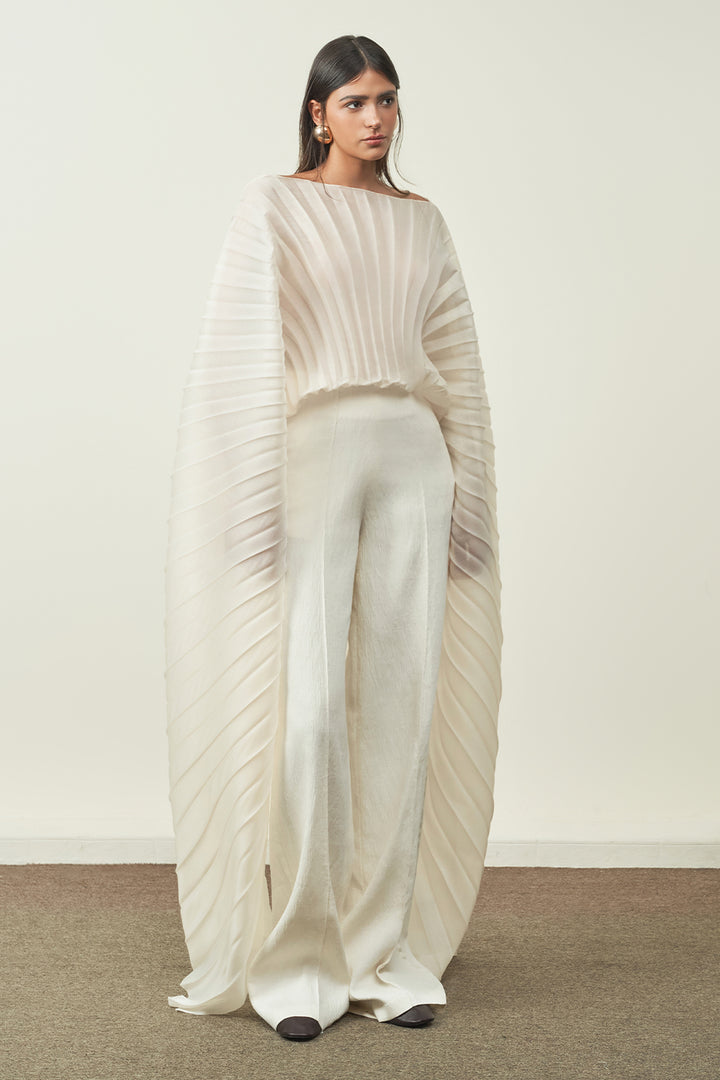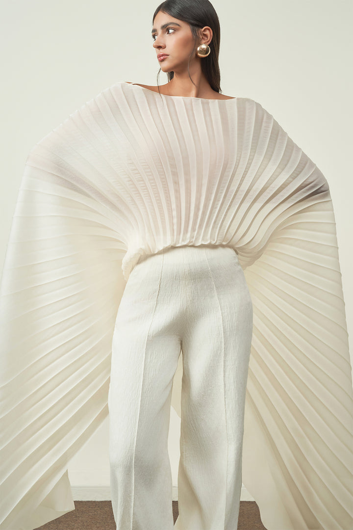 The top combines delicate craftsmanship with elegant design. Made from lightweight silk organza, this top features a trapezoid silhouette enhanced by precise pleating, creating graceful movement and a refined structure. Its maxi length adds a dramatic yet sophisticated touch, perfect for formal occasions or elevated everyday wear. This piece exemplifies luxury and artistry, offering both visual appeal and comfortable breathability.