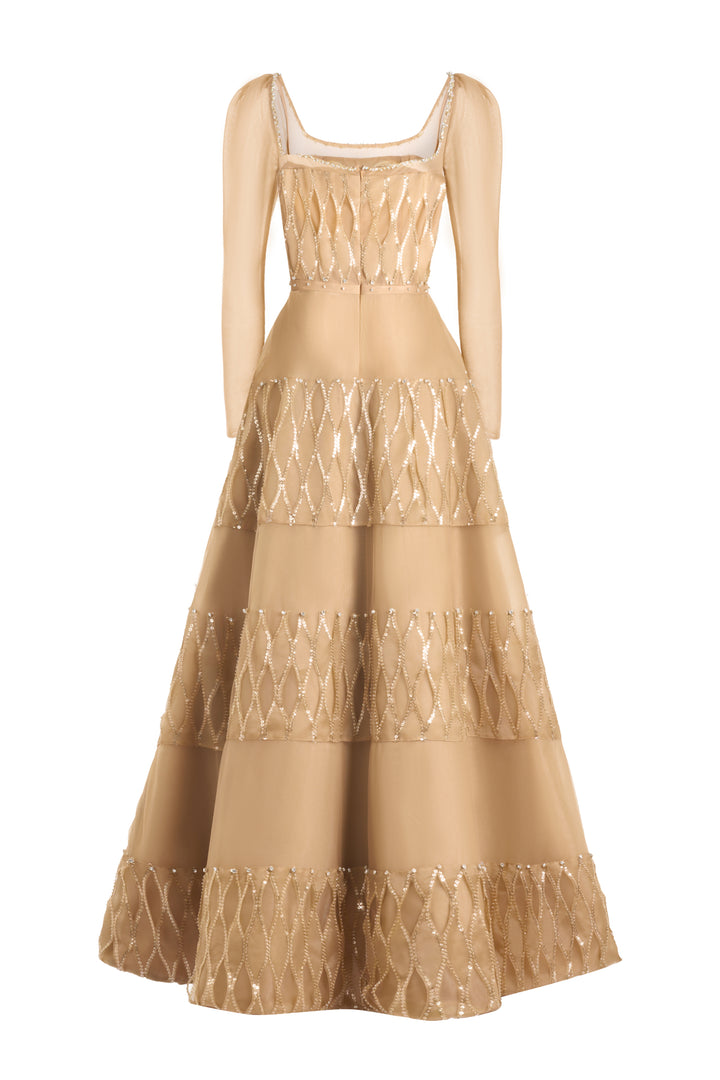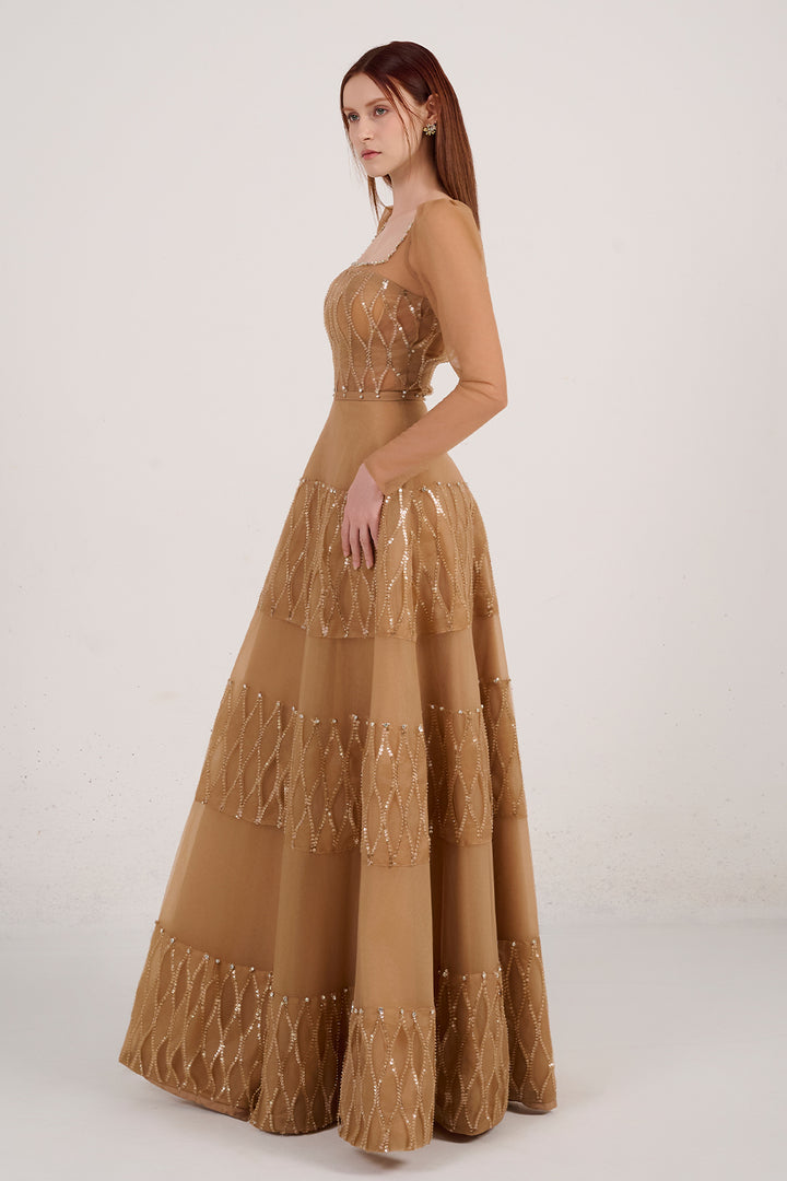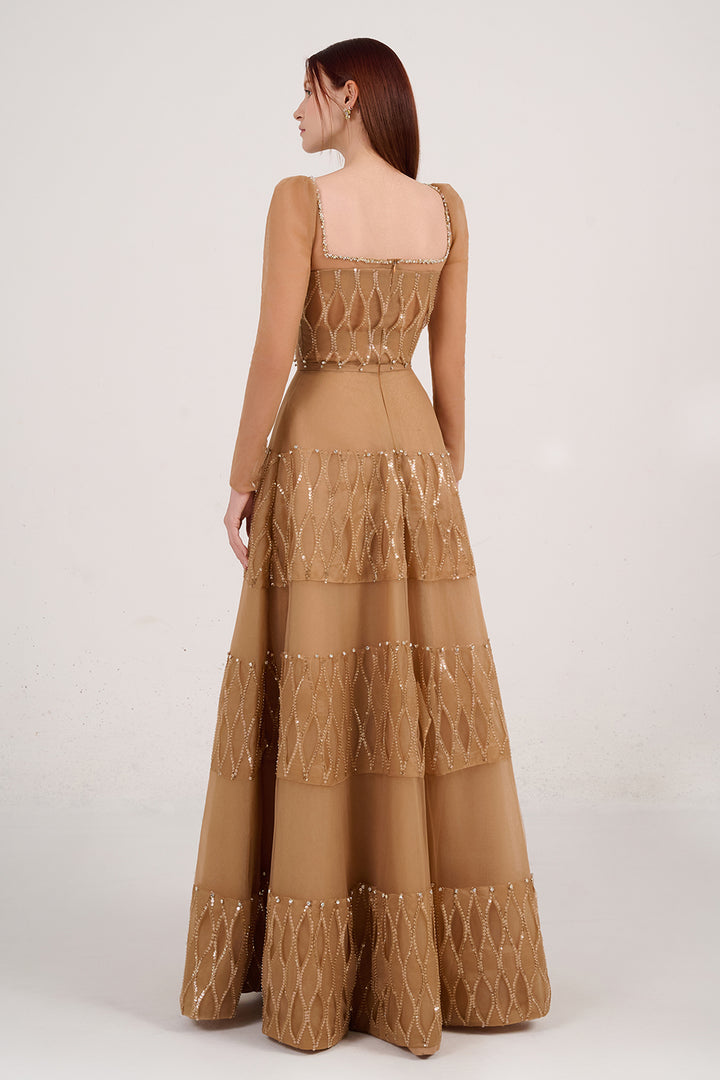 Chic and refined, the dress is a timeless statement of elegance. With its structured square neckline and full-length sleeves, this dress offers a perfect blend of modern minimalism and classic sophistication. The rich brown hue brings warmth and depth, making it an ideal choice for cooler seasons, evening events, or effortless day-to-night styling.