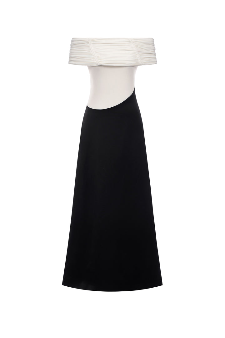 Elevate your wardrobe with this sophisticated A-line maxi dress, expertly crafted in luxurious taffeta. Featuring a timeless off-shoulder neckline and refined gathered details, this dress offers effortless elegance. Ideal for evening galas, weddings, and formal events.