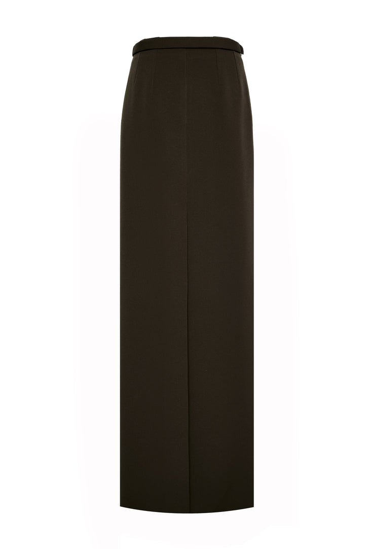This skirt features a sleek, straight silhouette that elongates the figure, enhanced by a belt strap at the waist for a refined, adjustable fit. Crafted from crepe fabric, it offers a smooth drape and comfortable wear, making it ideal for both formal and professional settings. The floor-length design adds elegance while the waist belt ensures a tailored look.