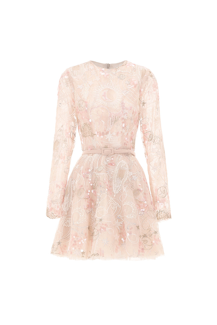 Expertly crafted by industry professionals, this dress boasts intricate embroidery and pleated detailing. The long sleeves add a touch of elegance while the mini length ensures a flattering fit. A must-have for any fashion-forward wardrobe.