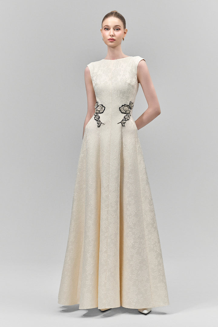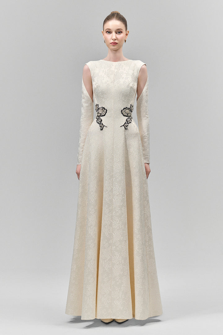 The dress features a sophisticated boat neckline and delicate lace fabric that enhances its elegant silhouette. Designed with a graceful cold shoulder cut, it offers a modern touch while maintaining classic charm. Intricate embroidery on the waist highlights and defines the figure, making this floor-length dress an exquisite choice for formal occasions.