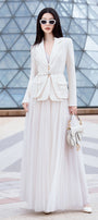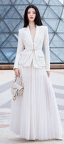 Two layered lapels, Faux flap pockets, Applique beads and flowers on the chest, Single-breasted with golden button, Dart lines, Matching fabric belt