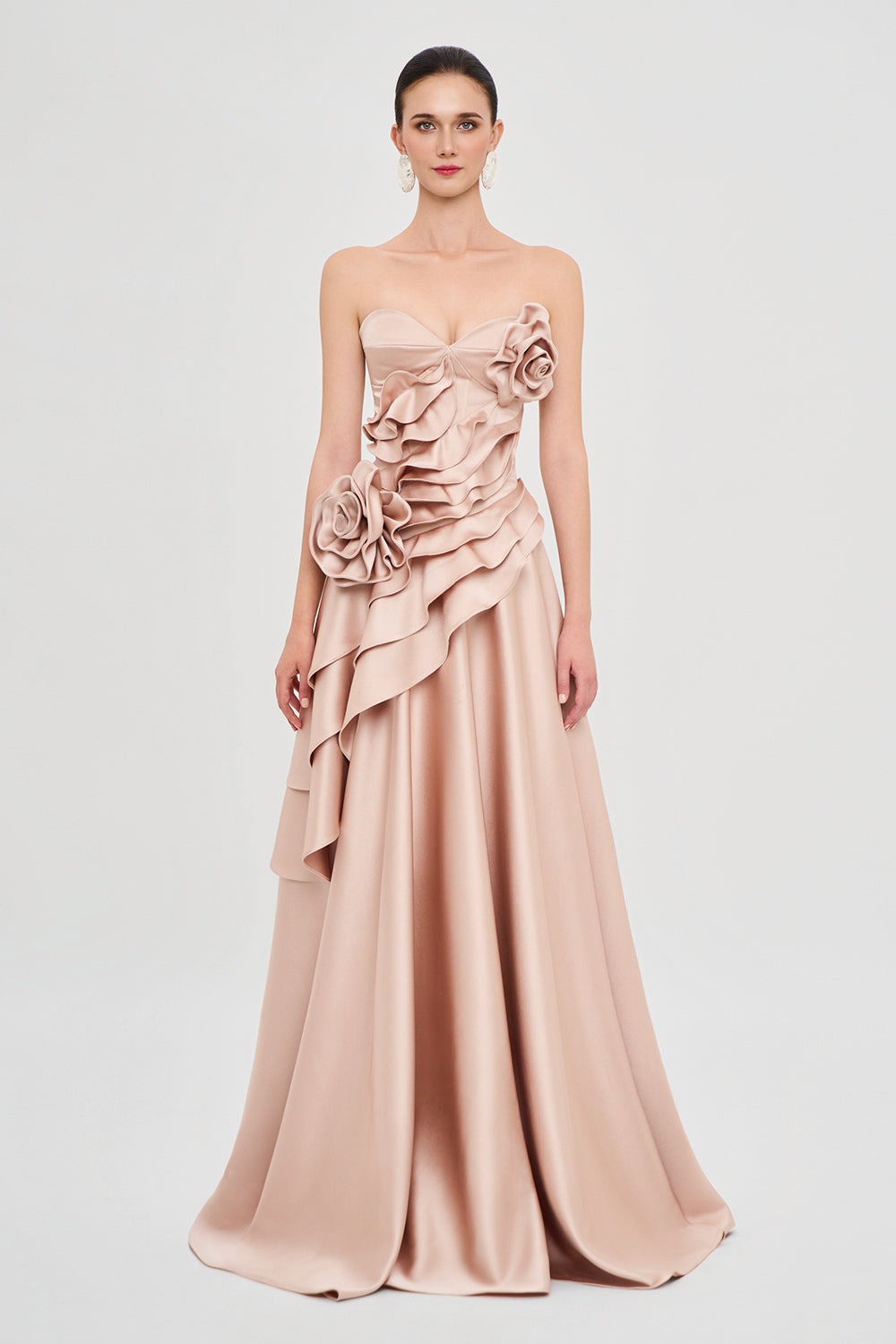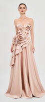 This A-line maxi dress features a flattering sweetheart neckline, elegant ruffle details, and delicate applique on luxurious taffeta. Expertly crafted, it's ideal for weddings, galas, and upscale soirées.
