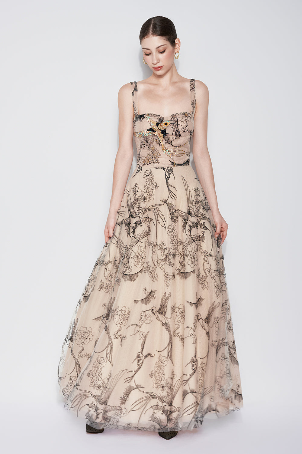 Timeless Crane A-line Semi-Heart Neck Tulle Maxi Dress