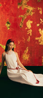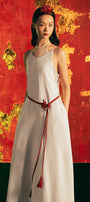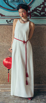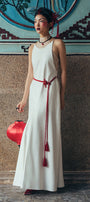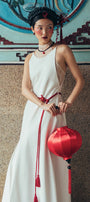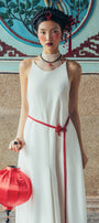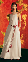 Slip into effortless elegance with this stunning A-line maxi dress, where playful sophistication meets timeless allure. Crafted from luxurious taffeta, the dress features a chic two-layer silhouette with a flattering halter neckline that commands attention. The signature red knots belt cinches the waist with a bold pop of color, adding movement and personality to every step. Perfect for resort getaways, evening soirées, or whenever you want to turn heads with understated glamour.
