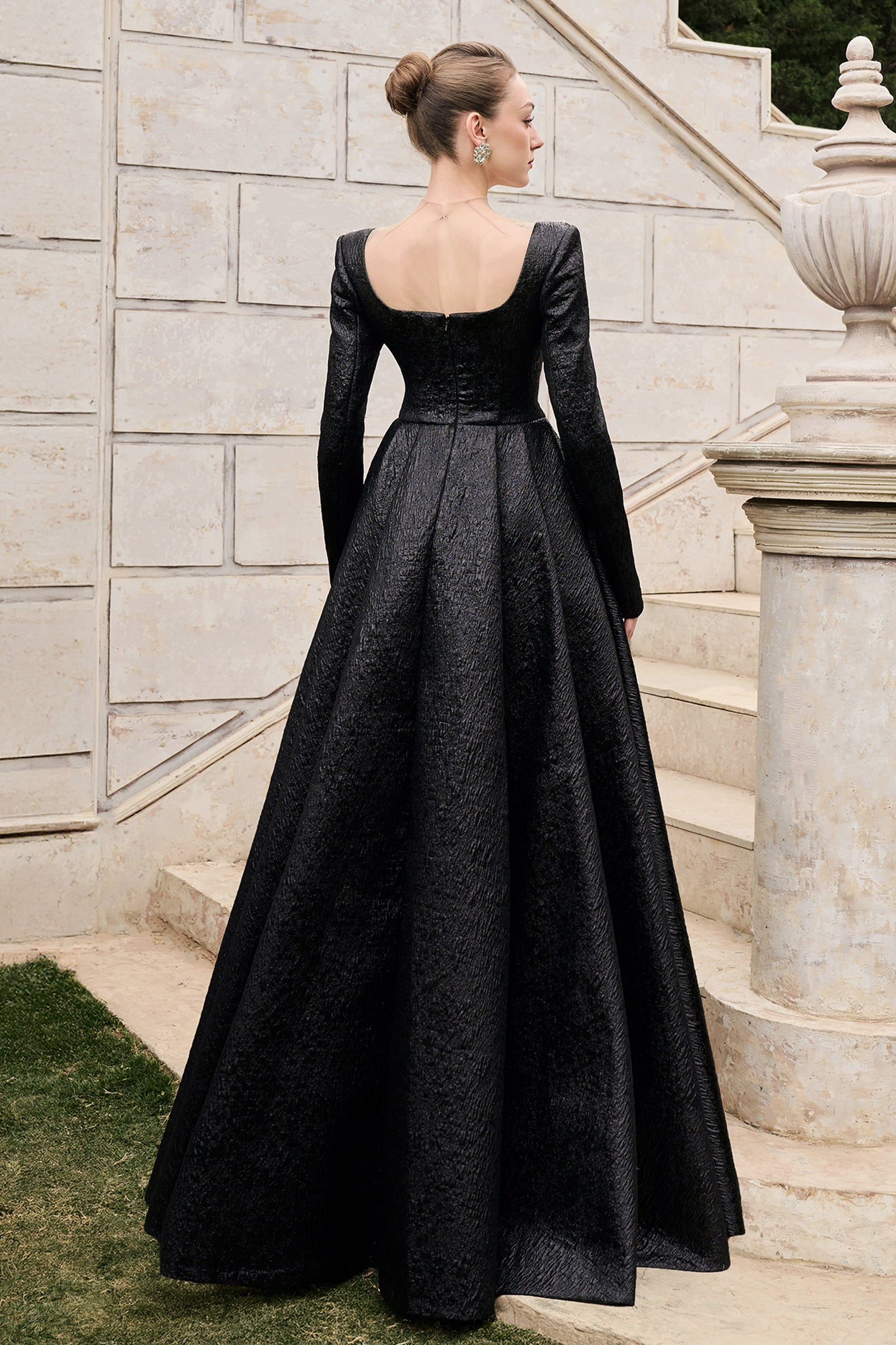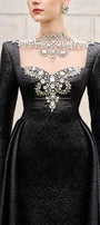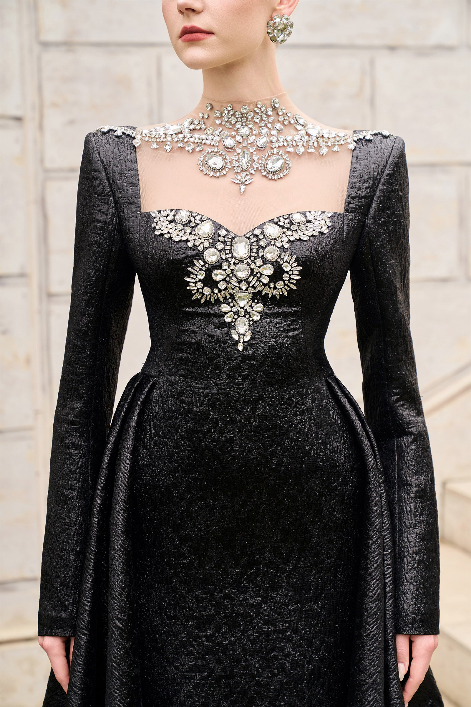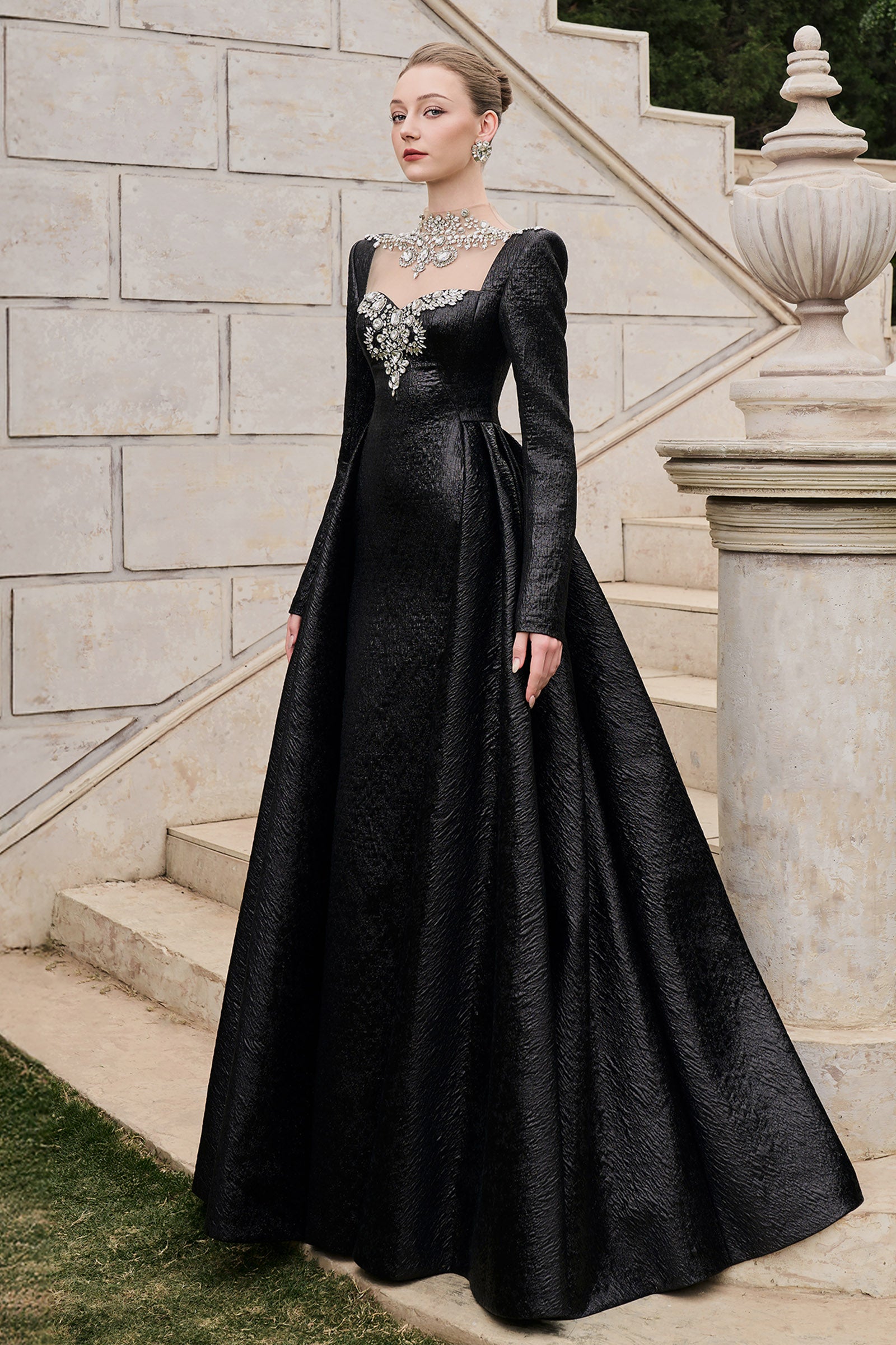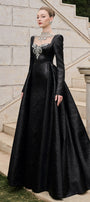Elevate your style with this expert-crafted A-line maxi dress featuring an illusion neckline and regular sleeves. Detailed bead embellishments add refined sparkle. Perfect for formal events, evening parties, or elegant occasions.