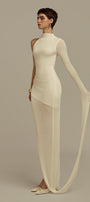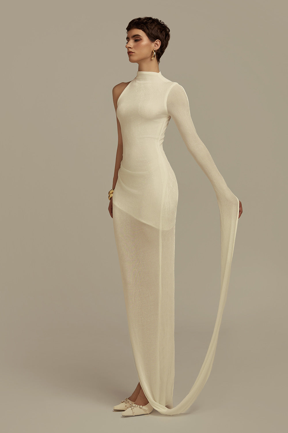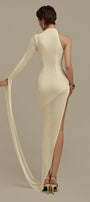 Hyperion Hourglass Asymmetric Sleeved Jersey Floor Length Dress