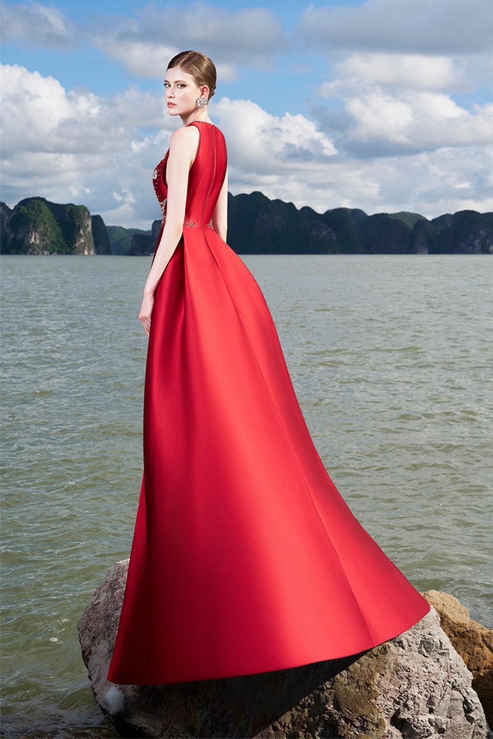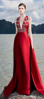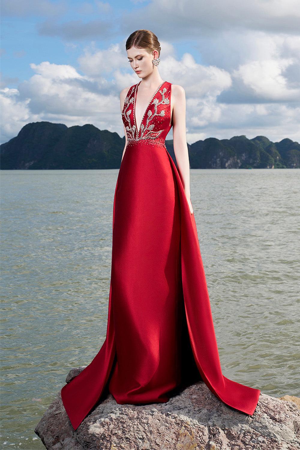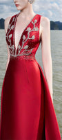 Deep V-neck, Stylized crystal embellished at the chest and wais, Draped both sides at the skirt, Long back flap, Hidden tear-drop zipper at the back
