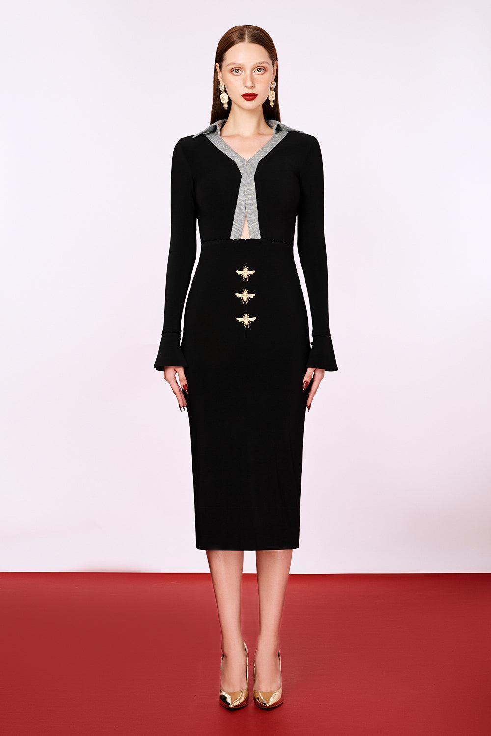 Collared neck, Greyline rim, Flared cuff sleeves, Cut-out on the front waist, Honey bees pin line on the front skirt, Back zipper