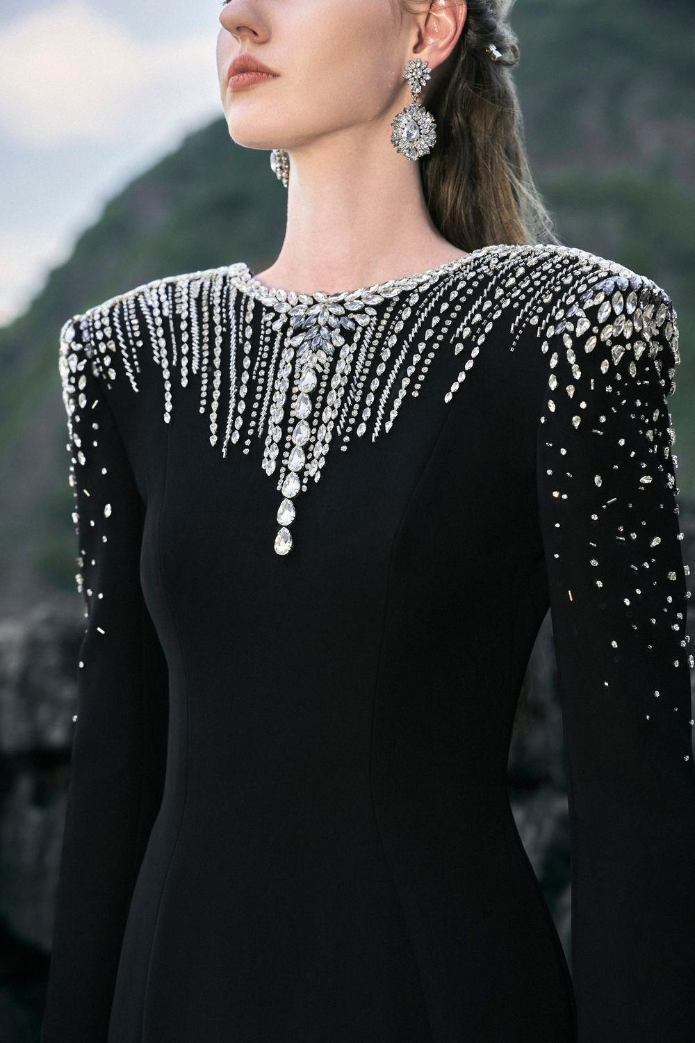 Attached crystal details, Padded shoulder, V-backless, Back slit