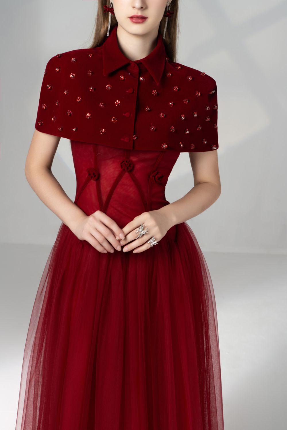 Special Features: Two-strap dress, Flower embellishments on the cape collar, Low-waisted with a zigzag corser waist