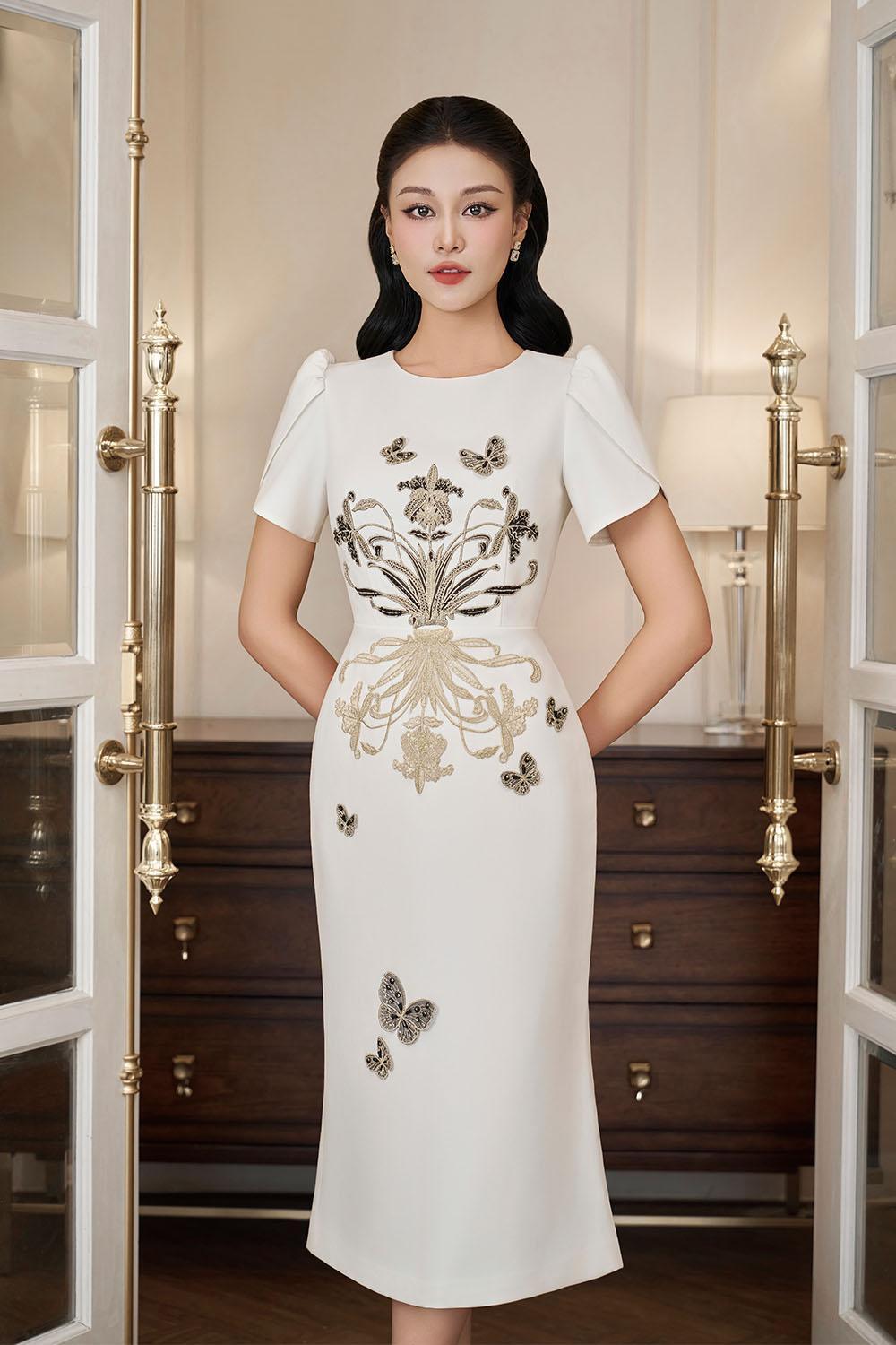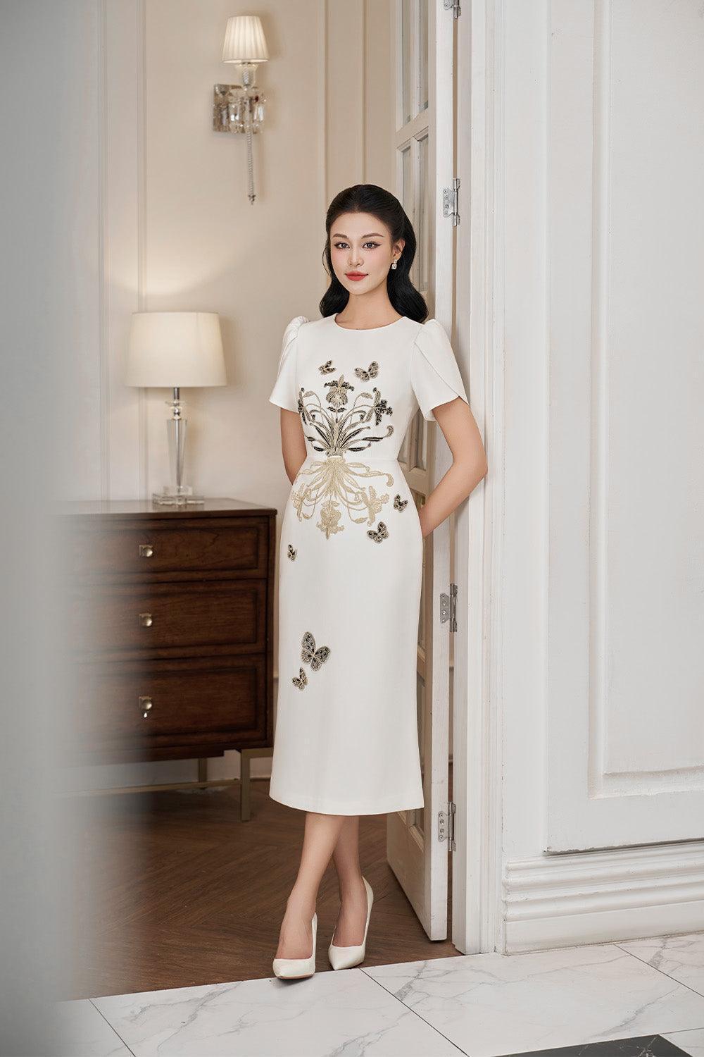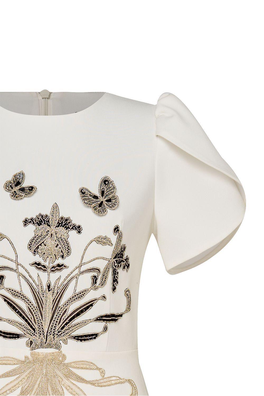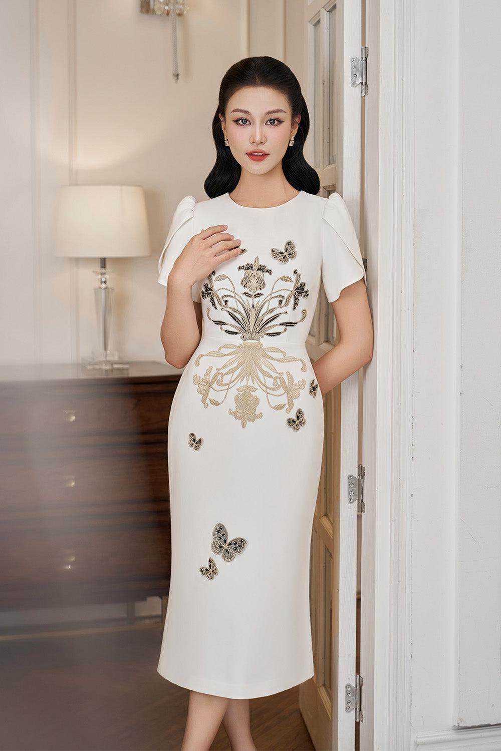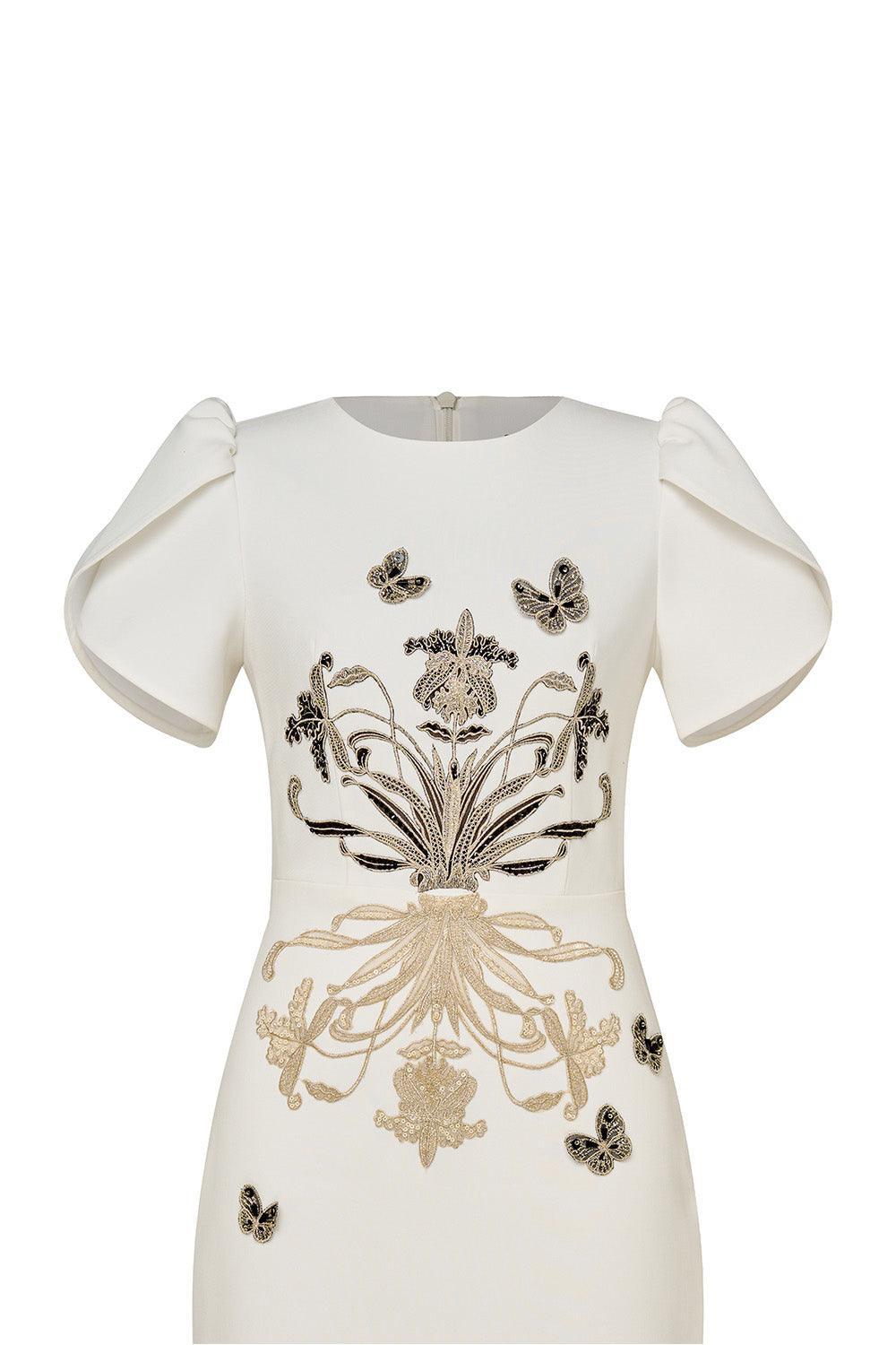 Wrapped tulip sleeves, Embossed floral embroidery, Embellished butterfly beads