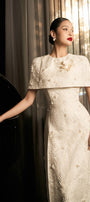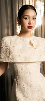 Special Features: Embossed floral embroidery with beads, 3D mini floral attached in the dress, Draped on the side, Detachable slit back cape, Sleeveless round neck dress
