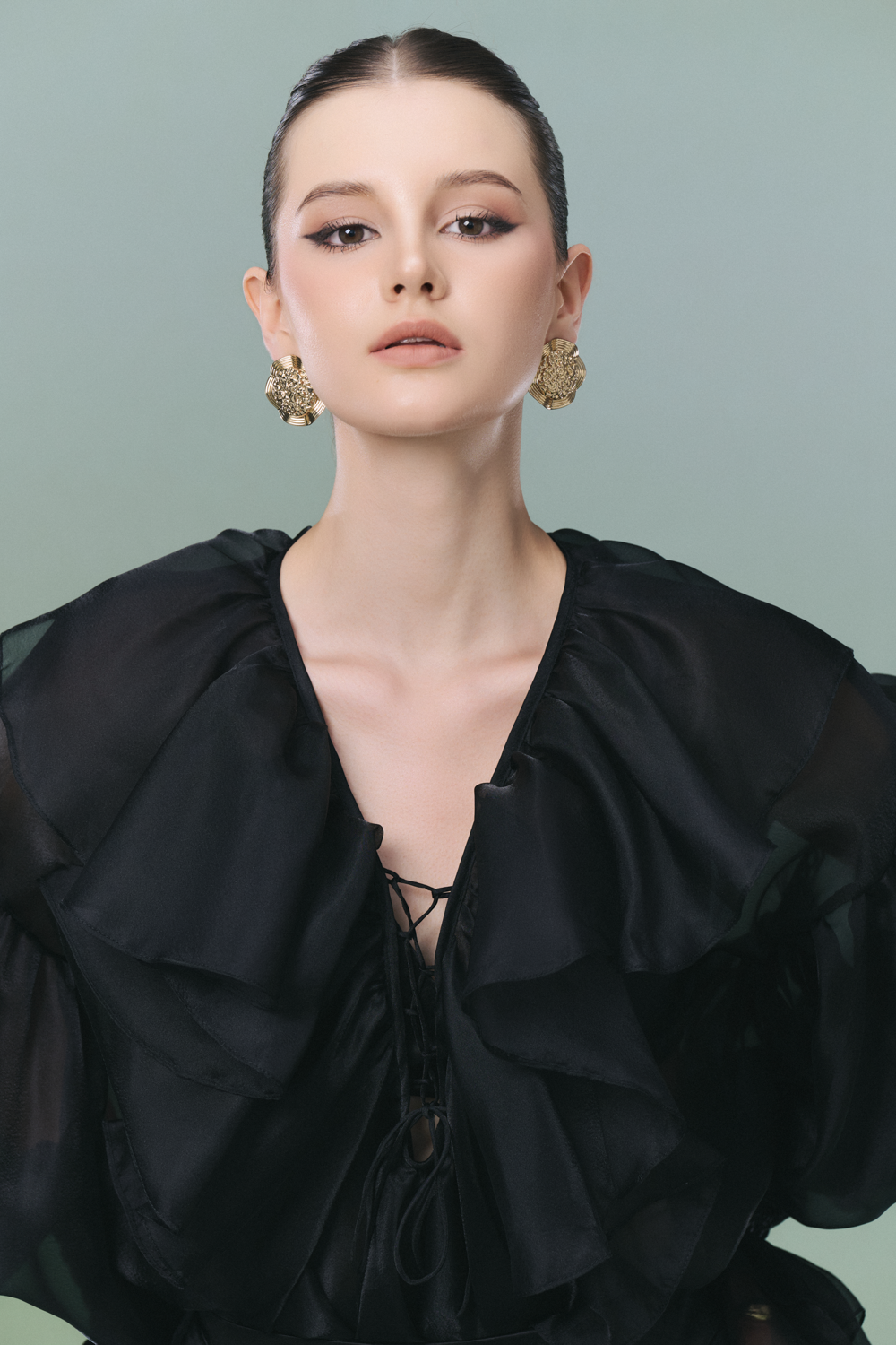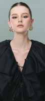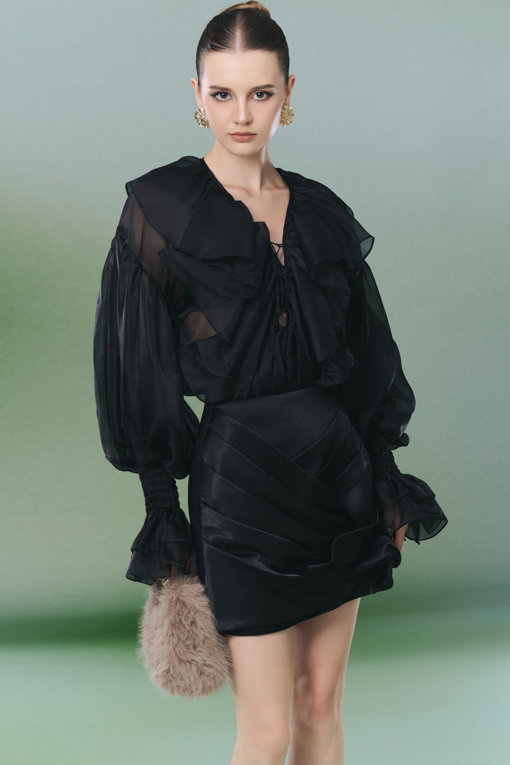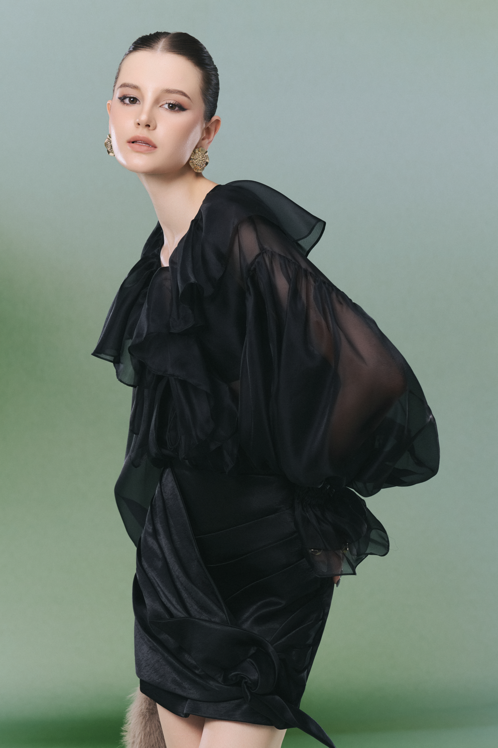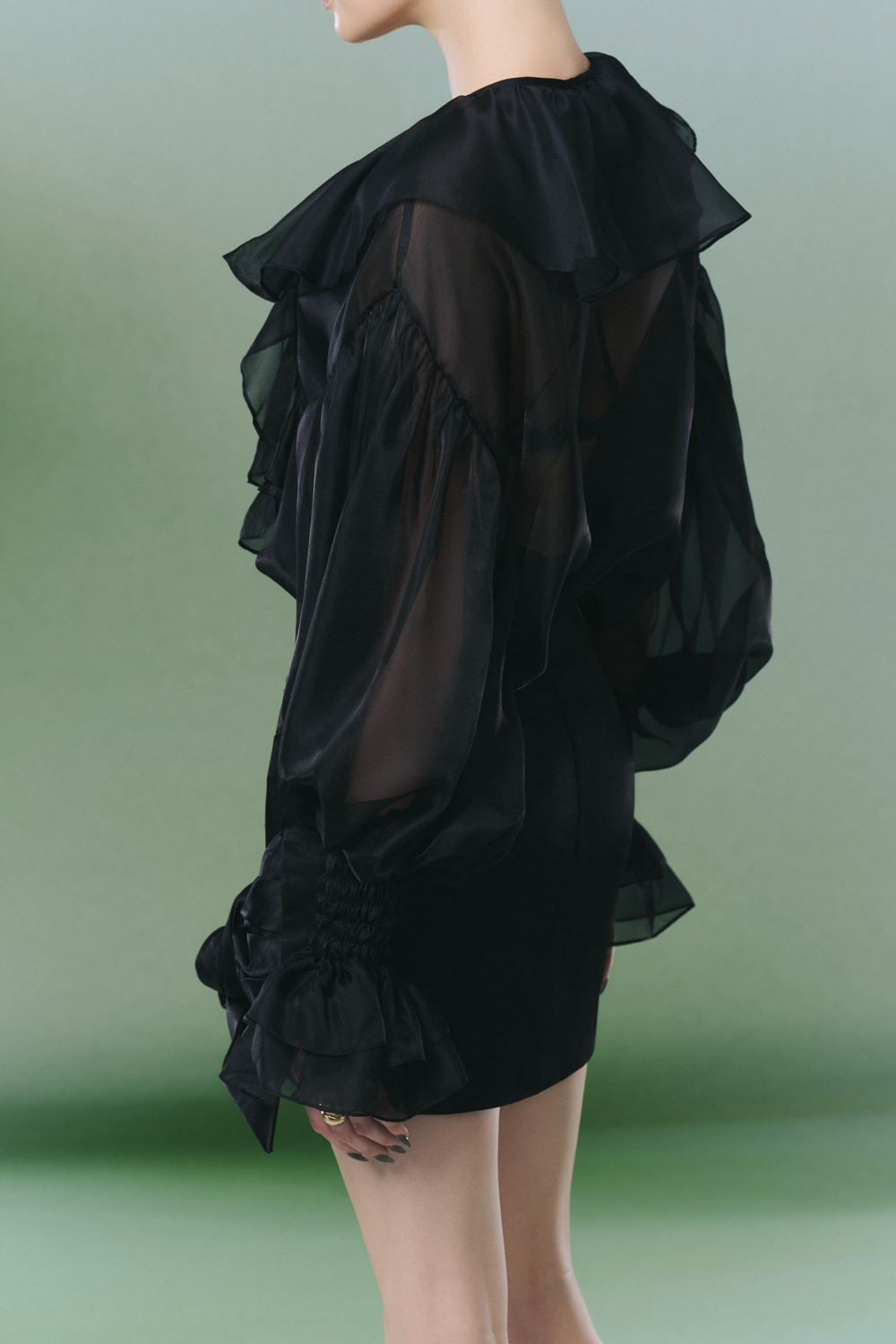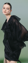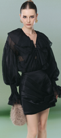Experience elevated style with this organza sheath set, featuring a refined V-neck, bishop sleeves, draped detailing, and elegant ruffle embellishments. Ideal for cocktail events, elegant dinners, or upscale gatherings.