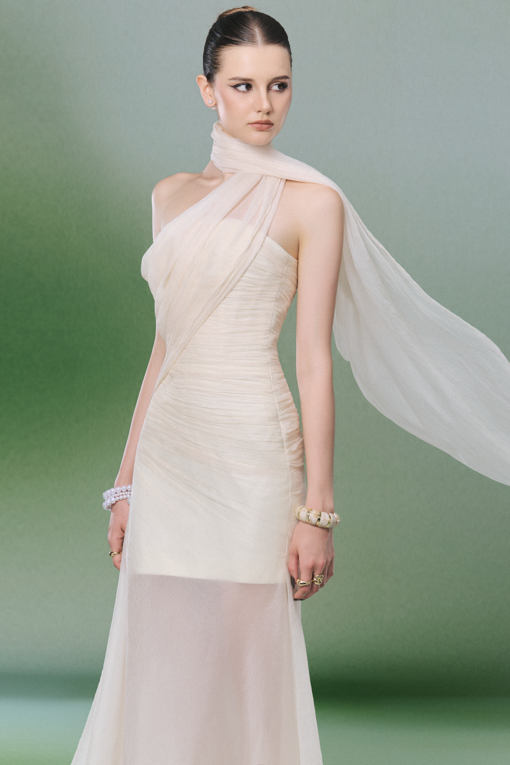 Elevate your wardrobe with this expertly tailored chiffon maxi dress. Featuring a sophisticated sheath silhouette, elegant scarf neck, and gathered detailing, it exudes contemporary refinement. Ideal for evening events, weddings, or elegant social gatherings.