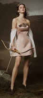 Elevate your style with this dress. This dress is bold, sculptural, and modern, making it a perfect statement piece for any occasion. The structured design and off-shoulder neckline add an empowered touch, while the mythical satin fabric adds a playful touch. Stand out in this unique and flattering dress.