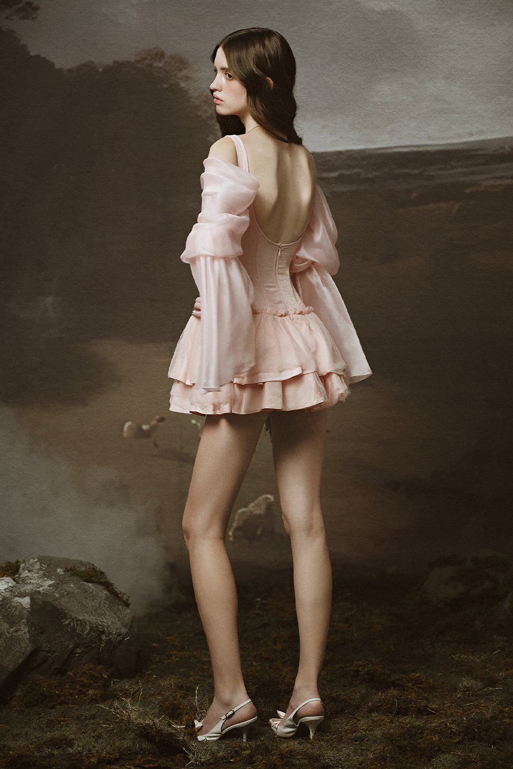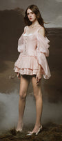 Structured corset with front hook closures, Off-shoulder draped sleeves with elastic string, Double layered ruffled mini skirt, Inner chest cup with lace trim