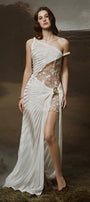 This dress is designed to flatter with its asymmetrical and pleated details. The elegant chiffon fabric adds a touch of sophistication while the embellished design makes it one of a kind. Modern and flowing, this structured dress is a must-have for any formal occasion.